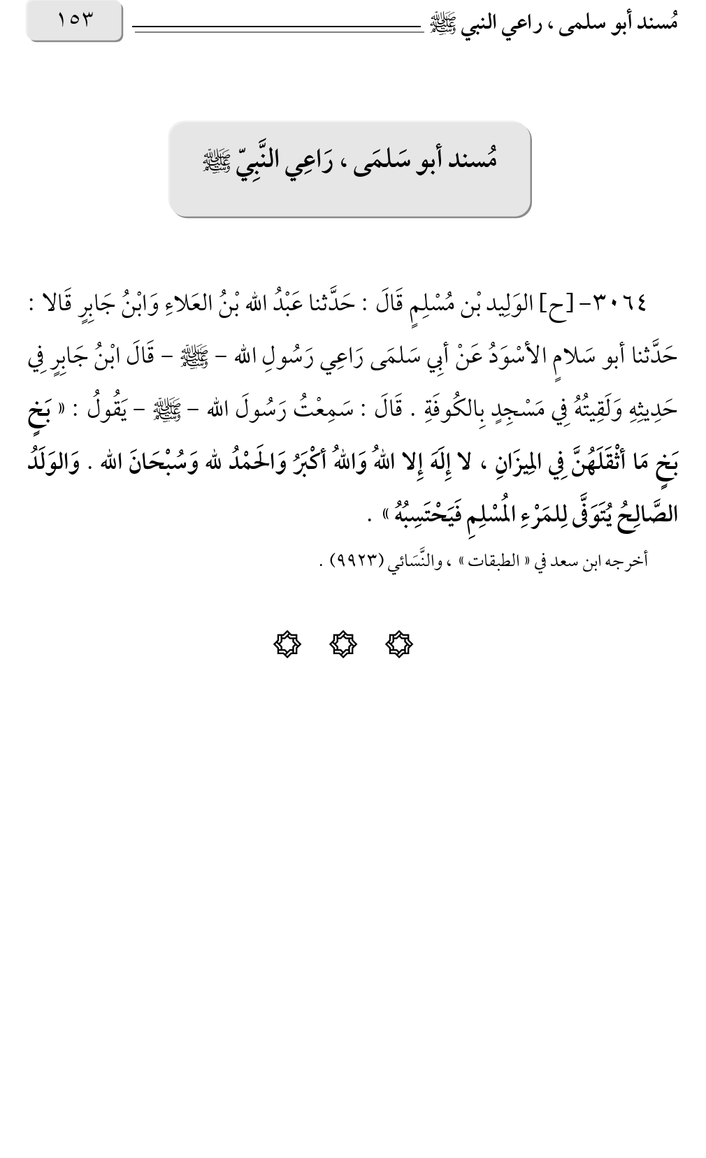 ٣٠٦٤ - [ح] الوَلِيد بْن مُسْلِمٍ قَالَ: حَدَّثنا عَبْدُ الله بْنُ العَلاءِ وَابْنُ جَابِرٍ قَالا: حَدَّثنا أبو سَلامٍ الأسْوَدُ عَنْ أبِي سَلمَى رَاعِي رَسُولِ الله - صلى الله عليه وسلم - قَالَ ابْنُ جَابِرٍ فِي حَدِيثِهِ وَلَقِيتُهُ فِي مَسْجِدٍ بِالكُوفَةِ. قَالَ: سَمِعْتُ رَسُولَ الله - صلى الله عليه وسلم - يَقُولُ: «بَخٍ بَخٍ مَا أثْقَلَهُنَّ فِي المِيزَانِ، لا إِلَهَ إِلا اللهُ وَاللهُ أكْبَرُ وَالحَمْدُ لله وَسُبْحَانَ الله. وَالوَلَدُ الصَّالِحُ يُتَوَفَّى لِلمَرْءِ المُسْلِمِ فَيَحْتَسِبُهُ».