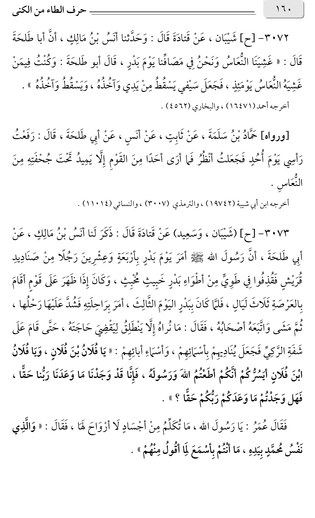 ٣٠٧٣ - [ح] (شَيْبَان، وَسَعِيد) عَنْ قَتادَةَ قَالَ: ذَكَرَ لَنا أنَسُ بْنُ مَالِكٍ، عَنْ أبِي طَلحَةَ، أنَّ رَسُولَ الله صلى الله عليه وسلم أمَرَ يَوْمَ بَدْرٍ بِأرْبَعَةٍ وَعِشْرِينَ رَجُلًا مِنْ صَنَادِيدِ قُرَيْشٍ فَقُذِفُوا فِي طَوِيٍّ مِنْ أطْوَاءِ بَدْرٍ خَبِيثٍ مُخْبِثٍ، وَكَانَ إِذَا ظَهَرَ عَلَى قَوْمٍ أقَامَ بِالعَرْصَةِ ثَلَاثَ لَيَالٍ، فَلمَّا كَانَ بِبَدْرٍ اليَوْمَ الثَّالِثَ، أمَرَ بِرَاحِلَتِهِ فَشُدَّ عَلَيْهَا رَحْلُها، ثُمَّ مَشَى وَاتَّبَعَهُ أصْحَابُهُ، فَقَالَ: مَا نُراهُ إِلَّا يَنْطَلِقُ لِيَقْضِيَ حَاجَتَهُ، حَتَّى قَامَ عَلَى شَفَةِ الرَّكِيِّ فَجَعَلَ يُنَادِيهِمْ بِأسْمَائِهِمْ، وَأسْمَاءِ أبائِهِمْ: «يَا فُلَانُ بْنَ فُلَانٍ، وَيَا فُلَانُ ابْنَ فُلَانٍ أيَسُرُّكُمْ أنَّكُمْ أطَعْتُمُ اللهَ وَرَسُولَهُ، فَإِنَّا قَدْ وَجَدْنَا مَا وَعَدَنَا رَبُّنا حَقًّا، فَهَل وَجَدْتُمْ مَا وَعَدَكُمْ رَبُّكُمْ حَقًّا؟ ».