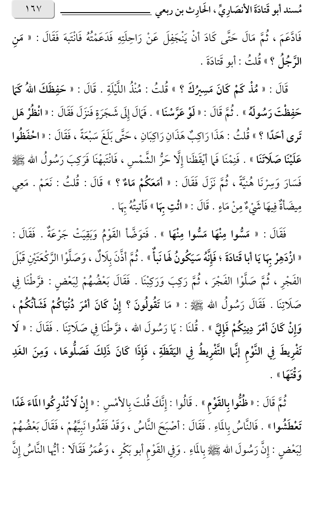 قَالَ: «مُذْ كَمْ كَانَ مَسِيرُكَ؟ » قُلتُ: مُنْذُ اللَّيْلَةِ. قَالَ: «حَفِظَكَ اللهُ كَمَا حَفِظْتَ رَسُولَهُ» ثُمَّ قَالَ: «لَوْ عَرَّسْنَا» فَمَالَ إِلَى شَجَرَةٍ فَنزَلَ فَقَالَ: «انْظُرْ هَل تَرى أحَدًا؟ » قُلتُ: هَذَا رَاكِبٌ هَذَانِ رَاكِبَانِ، حَتَّى بَلَغَ سَبْعَةً، فَقَالَ: «احْفَظُوا عَلَيْنَا صَلَاتَنَا» فَنِمْنَا فَما أيْقَظَنا إِلَّا حَرُّ الشَّمْسِ، فَانْتَبهْنَا فَرَكِبَ رَسُولُ الله صلى الله عليه وسلم. فَسَارَ وَسِرْنَا هُنيَّةً، ثُمَّ نَزَلَ فَقَالَ: «أمَعَكُمْ مَاءٌ؟ » قَالَ: قُلتُ: نَعَمْ. مَعِي مِيضَأةٌ فِيهَا شَيْءٌ مِنْ مَاءٍ. قَالَ: «ائْتِ بِهَا» فَأتيتُهُ بِهَا.