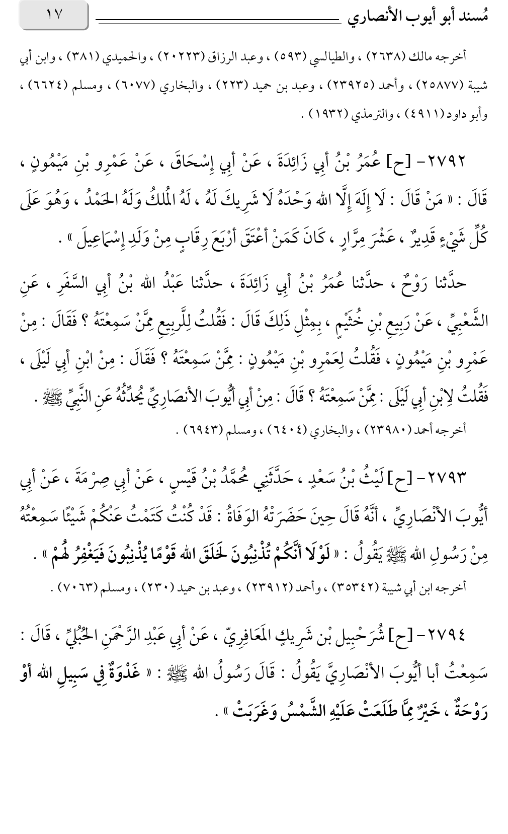 ٢٧٩٢ - [ح] عُمَرُ بْنُ أبِي زَائِدَةَ، عَنْ أبِي إِسْحَاقَ، عَنْ عَمْرِو بْنِ مَيْمُونٍ، قَالَ: «مَنْ قَالَ: لَا إِلَهَ إِلَّا الله وَحْدَهُ لَا شَرِيكَ لَهُ، لَهُ المُلكُ وَلَهُ الحَمْدُ، وَهُوَ عَلَى كُلِّ شَيْءٍ قَدِيرٌ، عَشْرَ مِرَّارٍ، كَانَ كَمَنْ أعْتَقَ أرْبَعَ رِقَابٍ مِنْ وَلَدِ إِسْمَاعِيلَ».