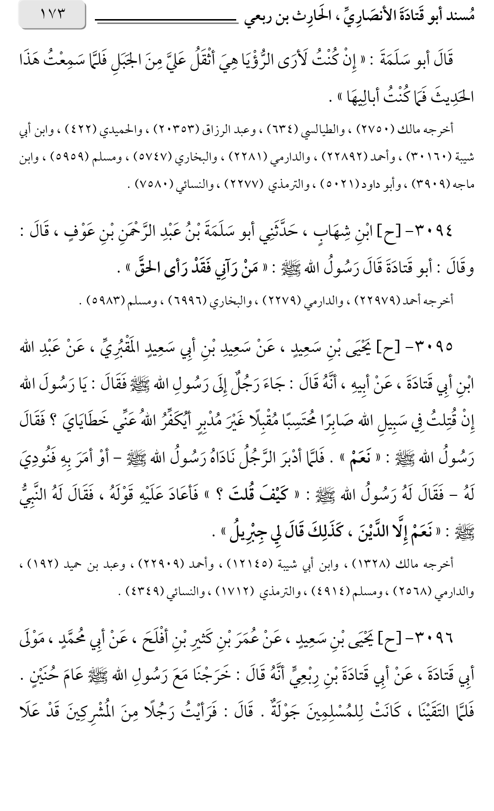 ٣٠٩٤ - [ح] ابْنِ شِهَابٍ، حَدَّثَنِي أبو سَلَمَةَ بْنُ عَبْدِ الرَّحْمَنِ بْنِ عَوْفٍ، قَالَ: وقَالَ: أبو قَتادَةَ قَالَ رَسُولُ الله صلى الله عليه وسلم: «مَنْ رَآنِي فَقَدْ رَأى الحقَّ».
