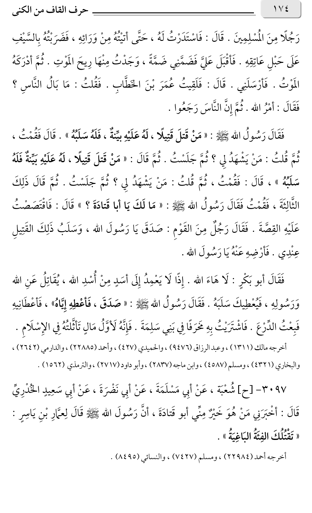 فَقَالَ رَسُولُ الله صلى الله عليه وسلم: «مَنْ قَتلَ قَتِيلًا، لَهُ عَلَيْهِ بيِّنةٌ، فَلَهُ سَلَبُهُ». قَالَ فَقُمْتُ، ثُمَّ قُلتُ: مَنْ يَشْهَدُ لِي؟ ثُمَّ جَلَسْتُ. ثُمَّ قَالَ: «مَنْ قَتلَ قَتِيلًا، لَهُ عَلَيْهِ بَيِّنةٌ فَلَهُ سَلَبُهُ» قَالَ: فَقُمْتُ، ثُمَّ قُلتُ: مَنْ يَشْهَدُ لِي؟ ثُمَّ جَلَسْتُ. ثُمَّ قَالَ ذَلِكَ، الثَّالِثَةَ، فَقُمْتُ فَقَالَ رَسُولُ الله صلى الله عليه وسلم: «مَا لَكَ يَا أبا قَتادَةَ؟ » قَالَ: فَاقْتَصَصْتُ عَلَيْهِ القِصَّةَ. فَقَالَ رَجُلٌ مِنَ القَوْمِ: صَدَقَ يَا رَسُولَ الله، وَسَلَبُ ذَلِكَ القَتِيلِ عِنْدِي. فَأرْضِهِ عَنْهُ يَا رَسُولَ الله.