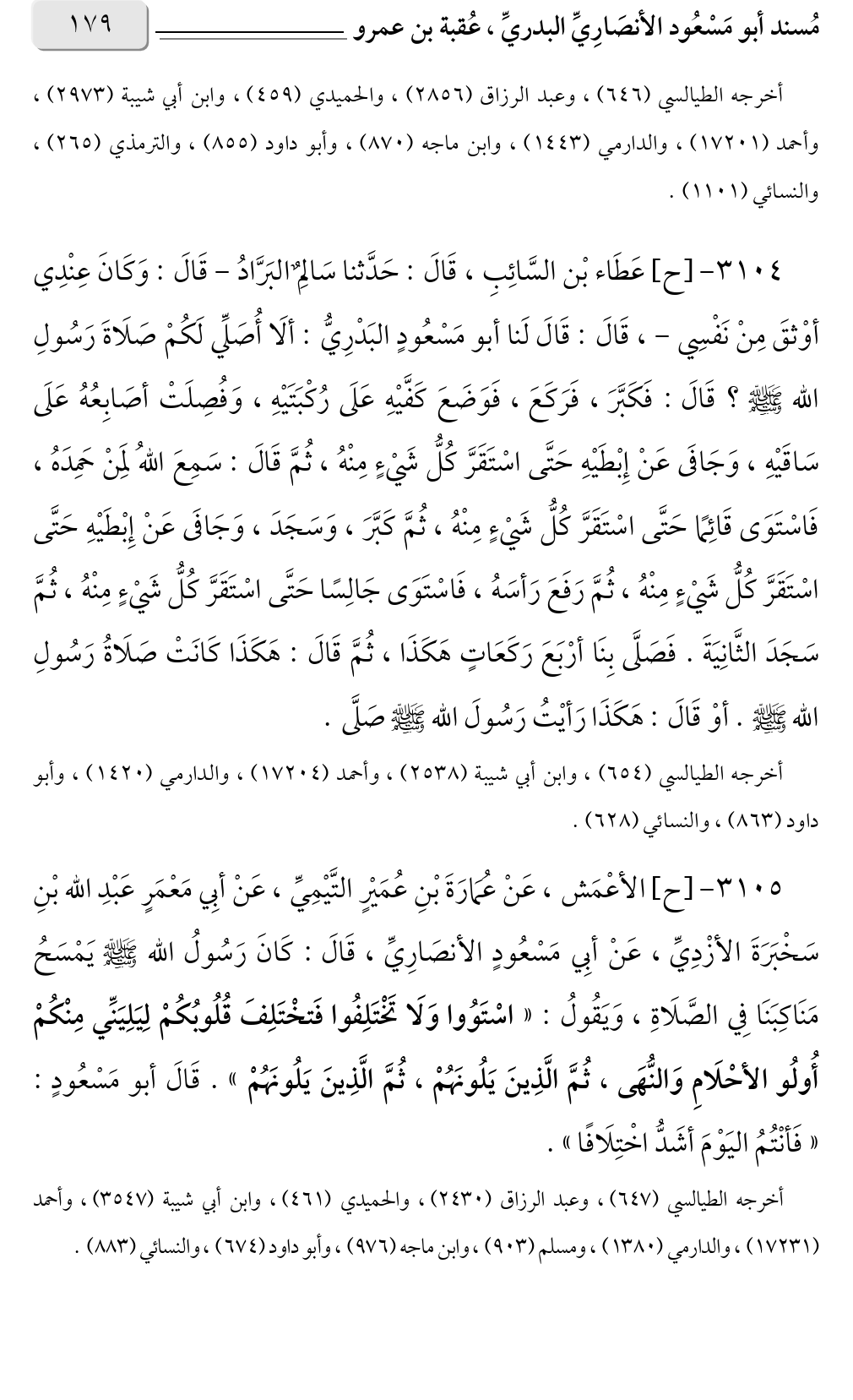 ٣١٠٤ - [ح] عَطَاء بْن السَّائِبِ، قَالَ: حَدَّثنا سَالِمٌ البَرَّادُ - قَالَ: وَكَانَ عِنْدِي أوْثقَ مِنْ نَفْسِي -، قَالَ: قَالَ لَنا أبو مَسْعُودٍ البَدْرِيُّ: ألَا أُصَلِّي لَكُمْ صَلَاةَ رَسُولِ الله صلى الله عليه وسلم؟ قَالَ: فَكَبَّرَ، فَرَكَعَ، فَوَضَعَ كَفَّيْهِ عَلَى رُكْبَتَيْهِ، وَفُصِلَتْ أصَابِعُهُ عَلَى سَاقَيْهِ، وَجَافَى عَنْ إِبْطَيْهِ حَتَّى اسْتَقَرَّ كُلُّ شَيْءٍ مِنْهُ، ثُمَّ قَالَ: سَمِعَ اللهُ لِمَنْ حَمِدَهُ، فَاسْتَوَى قَائِمًا حَتَّى اسْتَقَرَّ كُلُّ شَيْءٍ مِنْهُ، ثُمَّ كَبَّرَ، وَسَجَدَ، وَجَافَى عَنْ إِبْطَيْهِ حَتَّى اسْتَقَرَّ كُلُّ شَيْءٍ مِنْهُ، ثُمَّ رَفَعَ رَأسَهُ، فَاسْتَوَى جَالِسًا حَتَّى اسْتَقَرَّ كُلُّ شَيْءٍ مِنْهُ، ثُمَّ سَجَدَ الثَّانِيَةَ. فَصَلَّى بِنَا أرْبَعَ رَكَعَاتٍ هَكَذَا، ثُمَّ قَالَ: هَكَذَا كَانَتْ صَلَاةُ رَسُولِ الله صلى الله عليه وسلم. أوْ قَالَ: هَكَذَا رَأيْتُ رَسُولَ الله صلى الله عليه وسلم صَلَّى.