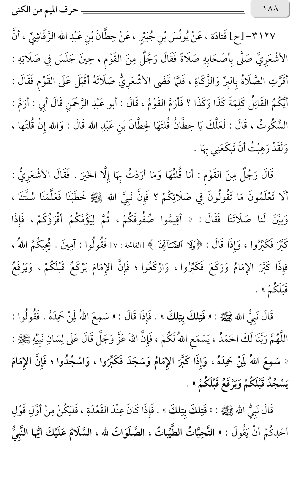 ٣١٢٧ - [ح] قَتادَة، عَنْ يُونُسَ بْنِ جُبَيْرٍ، عَنْ حِطَّانَ بْنِ عَبْدِ الله الرَّقَاشِيِّ، أنَّ الأشْعَرِيَّ صَلَّى بِأصْحَابِهِ صَلَاةً فَقَالَ رَجُلٌ مِنَ القَوْمِ، حِينَ جَلَسَ فِي صَلَاتِهِ: أقَرَّتِ الصَّلَاةُ بِالبِرِّ وَالزَّكَاةِ، فَلمَّا قَضَى الأشْعَرِيُّ صَلَاتَهُ أقْبَلَ عَلَى القَوْمِ فَقَالَ: أيُّكُمُ القَائِلُ كَلِمَةَ كَذَا وَكَذَا؟ فَأرَمَّ القَوْمُ، قَالَ: أبو عَبْدِ الرَّحْمَنِ قَالَ أبِي: أرَمَّ: السُّكُوتُ، قَالَ: لَعَلَّكَ يَا حِطَّانُ قُلتَهَا لحِطَّانَ بْنِ عَبْدِ الله قَالَ: وَالله إِنْ قُلتُها، وَلَقَدْ رَهِبْتُ أنْ تَبكَعَنِي بِهَا.