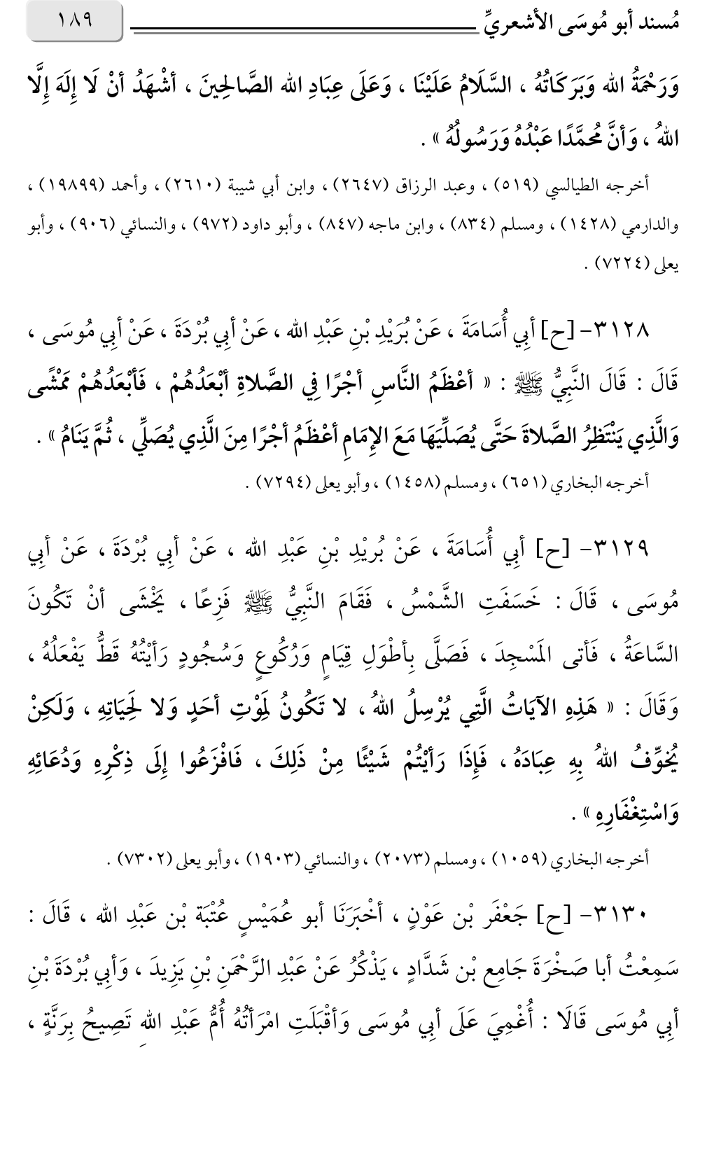 ٣١٢٨ - [ح] أبِي أُسَامَةَ، عَنْ بُرَيْدِ بْنِ عَبْدِ الله، عَنْ أبِي بُرْدَةَ، عَنْ أبِي مُوسَى، قَالَ: قَالَ النَّبِيُّ صلى الله عليه وسلم: «أعْظَمُ النَّاسِ أجْرًا فِي الصَّلاةِ أبْعَدُهُمْ، فَأبْعَدُهُمْ مَمْشًى وَالَّذِي يَنْتَظِرُ الصَّلاةَ حَتَّى يُصَلِّيَهَا مَعَ الإِمَامِ أعْظَمُ أجْرًا مِنَ الَّذِي يُصَلِّي، ثُمَّ يَنَامُ».