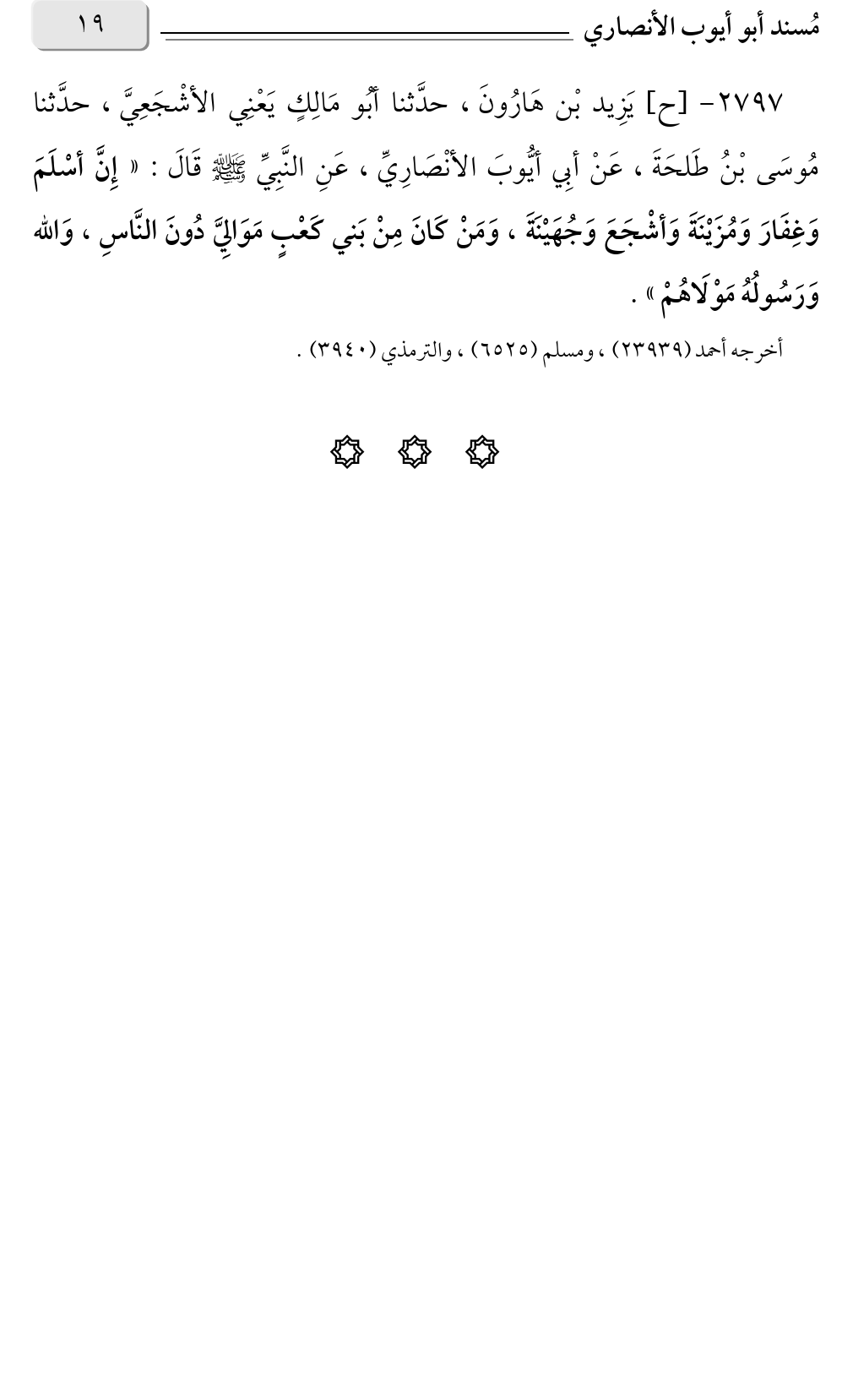 ٢٧٩٧ - [ح] يَزِيد بْن هَارُونَ، حدَّثنا أبُو مَالِكٍ يَعْنِي الأشْجَعِيَّ، حدَّثنا مُوسَى بْنُ طَلحَةَ، عَنْ أبِي أيُّوبَ الأنْصَارِيِّ، عَنِ النَّبِيِّ صلى الله عليه وسلم قَالَ: «إِنَّ أسْلَمَ وَغِفَارَ وَمُزَيْنَةَ وَأشْجَعَ وَجُهَيْنَةَ، وَمَنْ كَانَ مِنْ بَني كَعْبٍ مَوَالِيَّ دُونَ النَّاسِ، وَالله وَرَسُولُهُ مَوْلَاهُمْ».