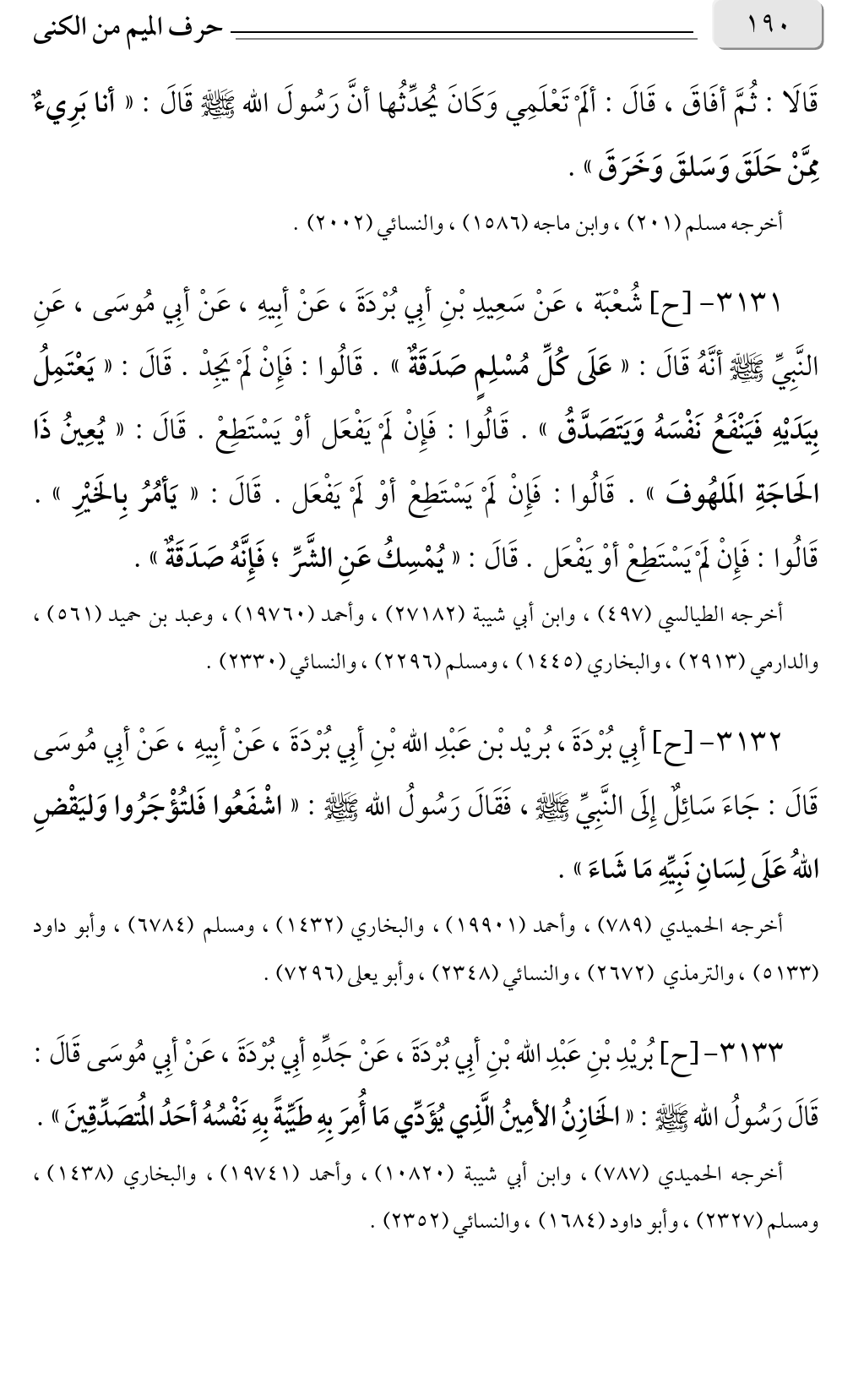 ٣١٣٣ - [ح] بُريْدِ بْنِ عَبْدِ الله بْنِ أبِي بُرْدَةَ، عَنْ جَدِّهِ أبِي بُرْدَةَ، عَنْ أبِي مُوسَى قَالَ: قَالَ رَسُولُ الله صلى الله عليه وسلم: «الخَازِنُ الأمِينُ الَّذِي يُؤَدِّي مَا أُمِرَ بِهِ طَيِّبةً بِهِ نَفْسُهُ أحَدُ المُتصَدِّقِينَ».