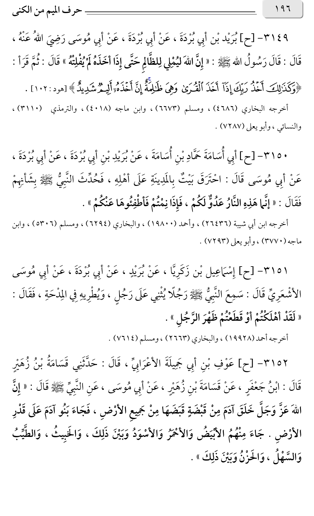 ٣١٤٩ - [ح] بُرَيْد بْن أبِي بُرْدَةَ، عَنْ أبِي بُرْدَةَ، عَنْ أبِي مُوسَى رَضِيَ اللهُ عَنْهُ، قَالَ: قَالَ رَسُولُ الله صلى الله عليه وسلم: «إِنَّ اللهَ ليُمْلي لِلظَّالِمِ حَتَّى إِذَا أخَذَهُ لَمْ يُفْلِتْهُ» قَالَ: ثُمَّ قَرَأ: {وَكَذَلِكَ أَخْذُ رَبِّكَ إِذَا أَخَذَ الْقُرَى وَهِيَ ظَالِمَةٌ إِنَّ أَخْذَهُ أَلِيمٌ شَدِيدٌ} [هود: ١٠٢].