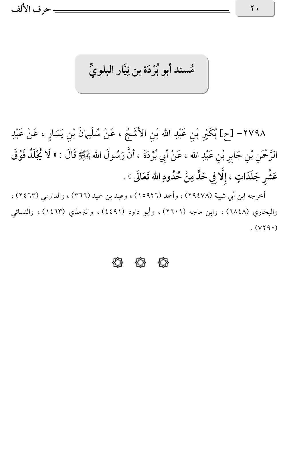 ٢٧٩٨ - [ح] بُكَيْرِ بْنِ عَبْدِ الله بْنِ الأشَجِّ، عَنْ سُلَيمانَ بْنِ يَسَارٍ، عَنْ عَبْدِ الرَّحْمَنِ بْنِ جَابِرِ بْنِ عَبْدِ الله، عَنْ أبِي بُرْدَةَ، أنَّ رَسُولَ الله صلى الله عليه وسلم قَالَ: «لَا يُجْلَدُ فَوْقَ عَشْرِ جَلَدَاتٍ، إِلَّا فِي حَدٍّ مِنْ حُدُودِ الله تَعَالَى».
