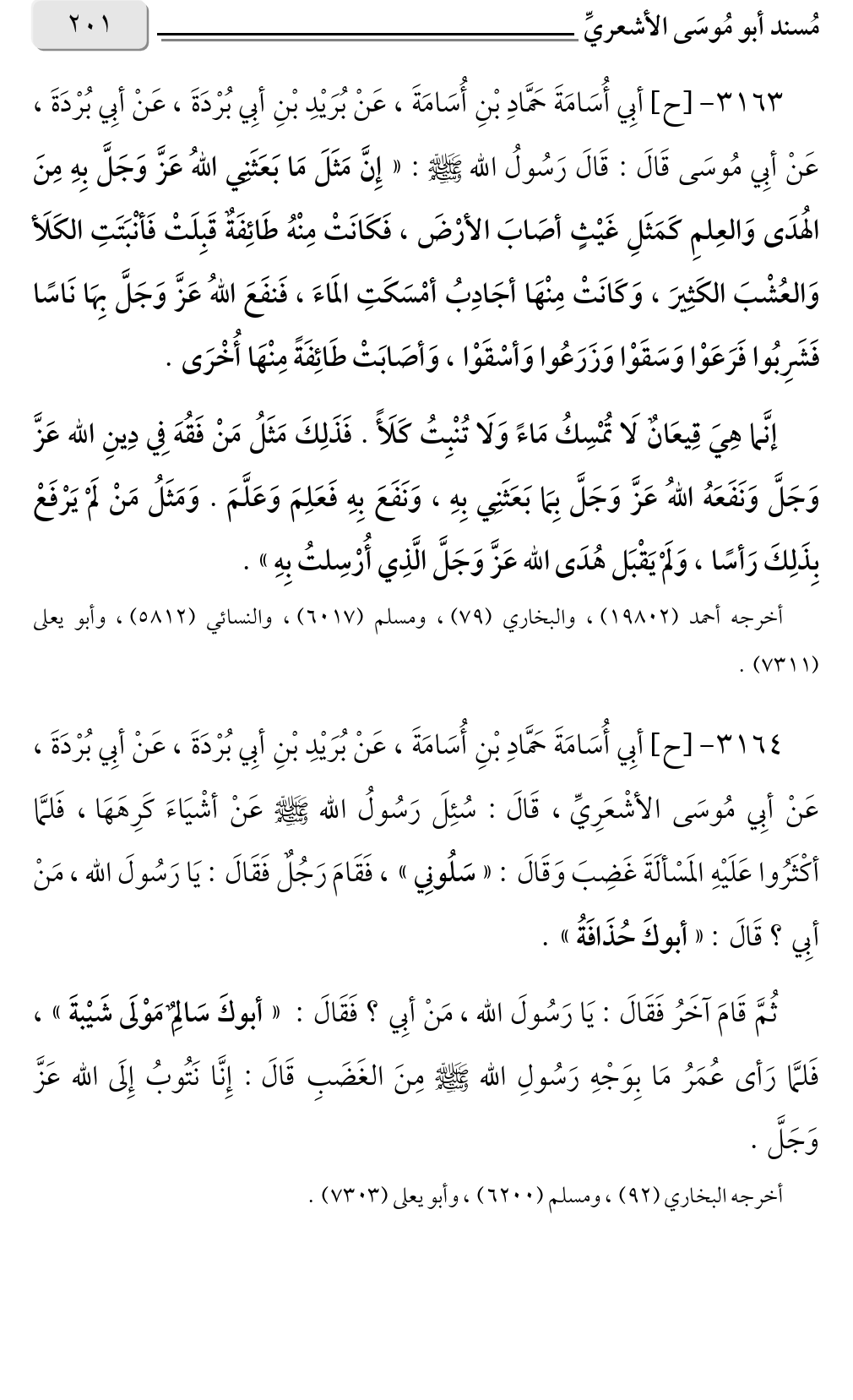 ٣١٦٣ - [ح] أبِي أُسَامَةَ حَمَّادِ بْنِ أُسَامَةَ، عَنْ بُرَيْدِ بْنِ أبِي بُرْدَةَ، عَنْ أبِي بُرْدَةَ، عَنْ أبِي مُوسَى قَالَ: قَالَ رَسُولُ الله صلى الله عليه وسلم: «إِنَّ مَثَلَ مَا بَعَثَنِي اللهُ عَزَّ وَجَلَّ بِهِ مِنَ الُهدَى وَالعِلمِ كَمَثَلِ غَيْثٍ أصَابَ الأرْضَ، فَكَانَتْ مِنْهُ طَائِفَةٌ قَبِلَتْ فَأنْبَتَتِ الكَلَأ وَالعُشْبَ الكَثِيرَ، وَكَانَتْ مِنْهَا أجَادِبُ أمْسَكَتِ المَاءَ، فَنفَعَ اللهُ عَزَّ وَجَلَّ بِهَا نَاسًا فَشَرِبُوا فَرَعَوْا وَسَقَوْا وَزَرَعُوا وَأسْقَوْا، وَأصَابَتْ طَائِفَةً مِنْهَا أُخْرَى.