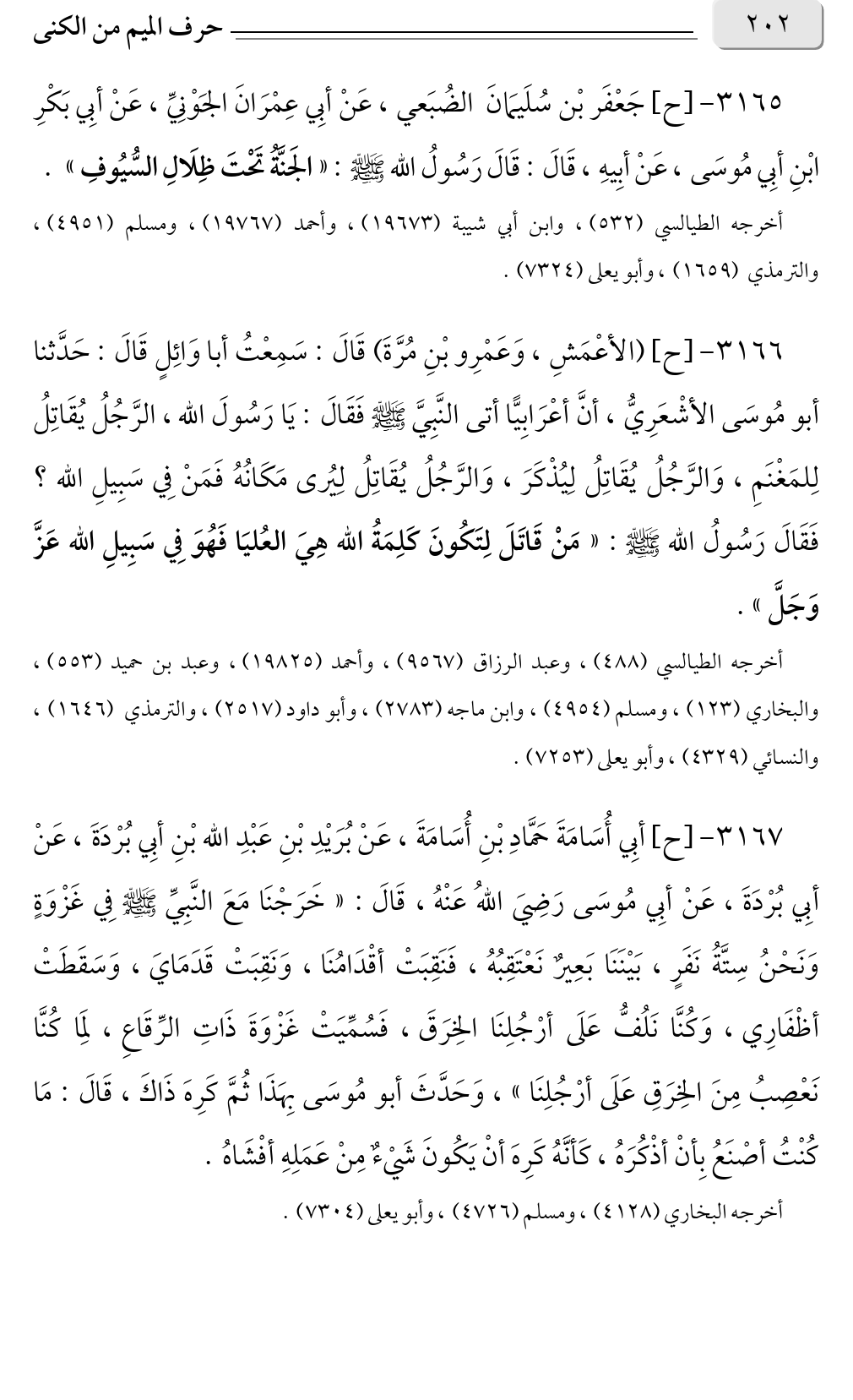 ٣١٦٥ - [ح] جَعْفَر بْن سُلَيمَانَ الضُبَعي، عَنْ أبِي عِمْرَانَ الجَوْنِيِّ، عَنْ أبِي بَكْرِ ابْنِ أبِي مُوسَى، عَنْ أبِيهِ، قَالَ: قَالَ رَسُولُ الله صلى الله عليه وسلم: «الجَنَّةُ تَحْتَ ظِلَالِ السُّيُوفِ».
