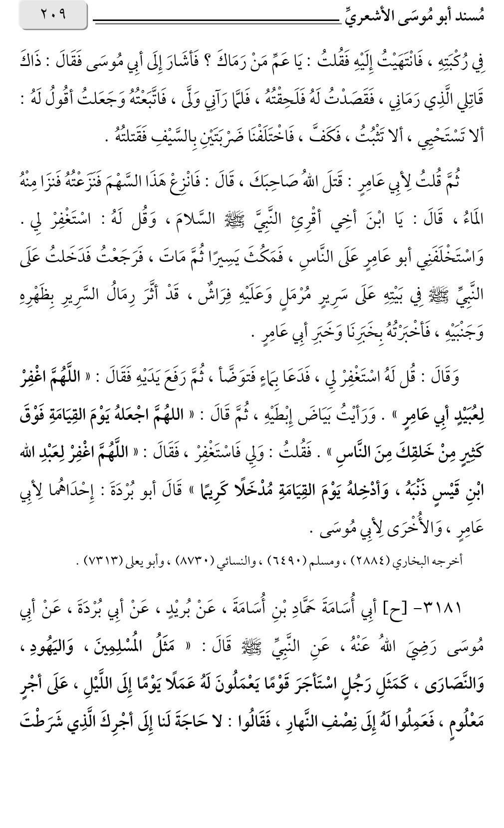 ثُمَّ قُلتُ لِأبِي عَامِرٍ: قَتلَ اللهُ صَاحِبَكَ، قَالَ: فَانْزِعْ هَذَا السَّهْمَ فَنَزَعْتُهُ فَنزَا مِنْهُ المَاءُ، قَالَ: يَا ابْنَ أخِي أقْرِئِ النَّبِيَّ صلى الله عليه وسلم السَّلامَ، وَقُل لَهُ: اسْتَغْفِرْ لِي. وَاسْتَخْلَفَنِي أبو عَامِرٍ عَلَى النَّاسِ، فَمَكُثَ يَسِيرًا ثُمَّ مَاتَ، فَرَجَعْتُ فَدَخَلتُ عَلَى النَّبِيِّ صلى الله عليه وسلم فِي بَيْتِهِ عَلَى سَرِيرٍ مُرْمَلٍ وَعَلَيْهِ فِرَاشٌ، قَدْ أثَّرَ رِمَالُ السَّرِيرِ بِظَهْرِهِ وَجَنْبَيْهِ، فَأخْبَرْتُهُ بِخَبَرِنَا وَخَبَرِ أبِي عَامِرٍ.
