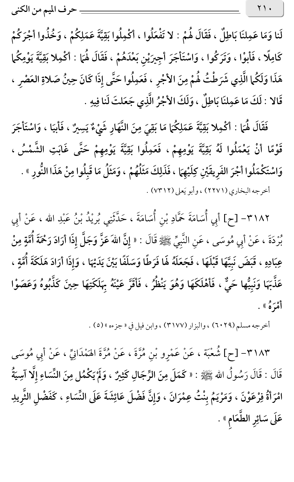٣١٨٣ - [ح] شُعْبَة، عَنْ عَمْرٍو بْنِ مُرَّةَ، عَنْ مُرَّةَ الهَمْدَانِيِّ، عَنْ أبِي مُوسَى قَالَ: قَالَ رَسُولُ الله صلى الله عليه وسلم: «كَمَلَ مِنَ الرِّجَالِ كَثِيرٌ، وَلَمْ يَكْمُل مِنَ النِّسَاءِ إِلَّا آسِيَةُ امْرَأةُ فِرْعَوْنَ، وَمَرْيَمُ بِنْتُ عِمْرَانَ، وَإِنَّ فَضْلَ عَائِشَةَ عَلَى النِّسَاءِ، كَفَضْلِ الثَّرِيدِ عَلَى سَائِرِ الطَّعَامِ».