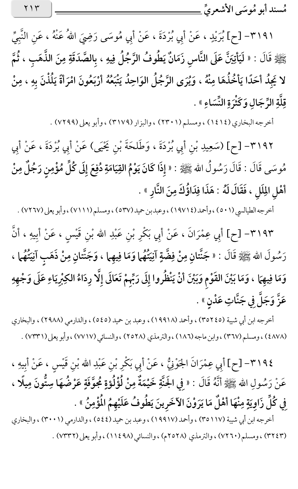 ٣١٩١ - [ح] بُرَيْدٍ، عَنْ أبِي بُرْدَةَ، عَنْ أبِي مُوسَى رَضِيَ اللهُ عَنْهُ، عَنِ النَّبِيِّ صلى الله عليه وسلم قَالَ: «لَيَأتِيَنَّ عَلَى النَّاسِ زَمَانٌ يَطُوفُ الرَّجُلُ فِيهِ، بِالصَّدَقَةِ مِنَ الذَّهَبِ، ثُمَّ لا يَجِدُ أحَدًا يَأخُذُهَا مِنْهُ، وَيُرَى الرَّجُلُ الوَاحِدُ يَتْبَعُهُ أرْبَعُونَ امْرَأةً يَلُذْنَ بِهِ، مِنْ قِلَّةِ الرِّجَالِ وَكَثْرَةِ النِّسَاءِ».