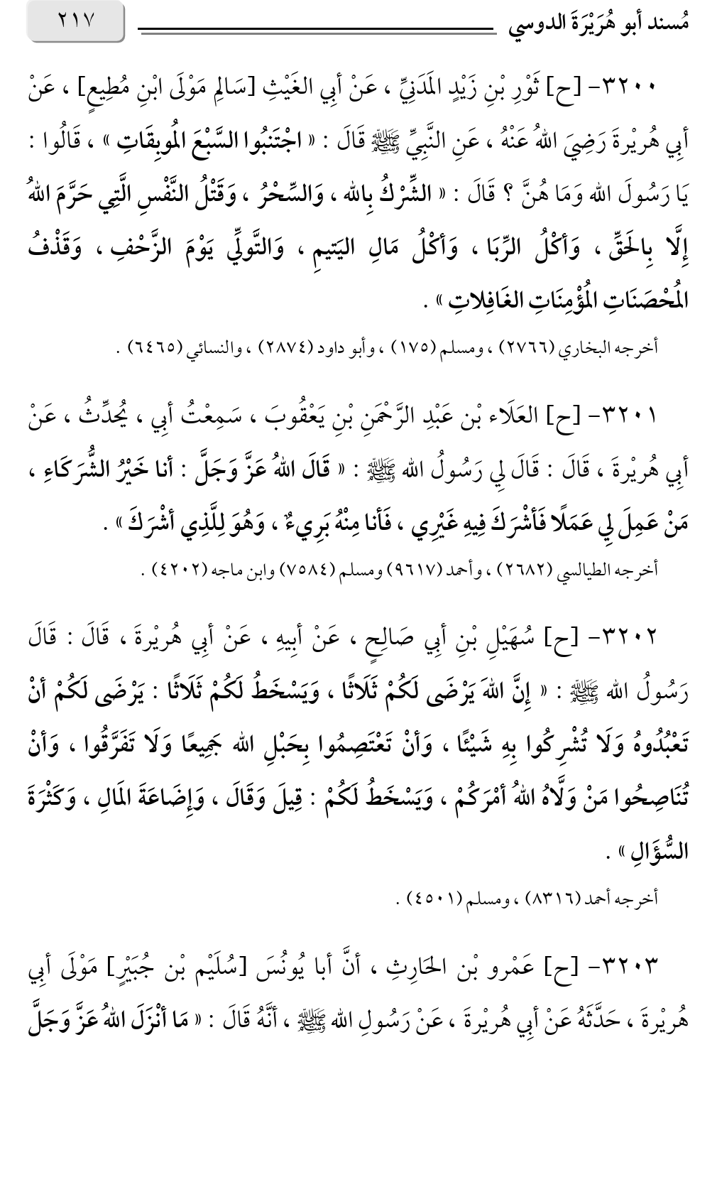 ٣٢٠٢ - [ح] سُهَيْلِ بْنِ أبِي صَالِحٍ، عَنْ أبِيهِ، عَنْ أبِي هُريْرةَ، قَالَ: قَالَ رَسُولُ الله صلى الله عليه وسلم: «إِنَّ اللهَ يَرْضَى لَكُمْ ثَلَاثًا، وَيَسْخَطُ لَكُمْ ثَلَاثًا: يَرْضَى لَكُمْ أنْ تَعْبُدُوهُ وَلَا تُشْرِكُوا بِهِ شَيْئًا، وَأنْ تَعْتَصِمُوا بِحَبْلِ الله جَمِيعًا وَلَا تَفَرَّقُوا، وَأنْ تُنَاصِحُوا مَنْ وَلَّاهُ اللهُ أمْرَكُمْ، وَيَسْخَطُ لَكُمْ: قِيلَ وَقَالَ، وَإِضَاعَةَ المَالِ، وَكَثْرَةَ السُّؤَالِ».
