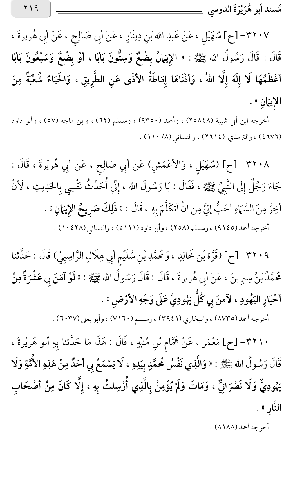 ٣٢٠٧ - [ح] سُهَيْلٍ، عَنْ عَبْدِ الله بْنِ دِينَارٍ، عَنْ أبِي صَالِحٍ، عَنْ أبِي هُريْرةَ، قَالَ: قَالَ رَسُولُ الله صلى الله عليه وسلم: «الإِيمَانُ بِضْعٌ وَسِتُّونَ بَابًا، أوْ بِضْعٌ وَسَبْعُونَ بَابًا أعْظَمُهَا لَا إِلَهَ إِلَّا اللهُ، وَأدْنَاهَا إِمَاطَةُ الأذَى عَنِ الطَّرِيقِ، وَالحَيَاءُ شُعْبَةٌ مِنَ الإِيمَانِ».