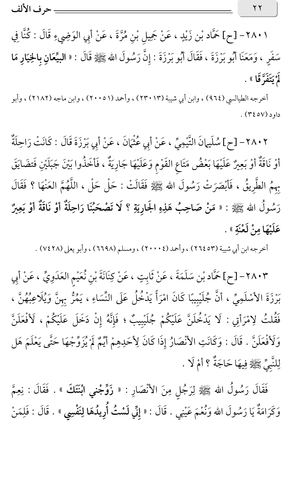 ٢٨٠٣ - [ح] حَمَّاد بْن سَلَمَةَ، عَنْ ثَابِتٍ، عَنْ كِنَانَةَ بْنِ نُعَيْمٍ العَدَوِيِّ، عَنْ أبِي بَرْزَةَ الأسْلَمِيِّ، أنَّ جُلَيْبِيبًا كَانَ امْرَأً يَدْخُلُ عَلَى النِّسَاءِ، يَمُرُّ بِهِنَّ وَيُلَاعِبُهُنَّ، فَقُلتُ لِامْرَأتِي: لَا يَدْخُلَنَّ عَلَيْكُمْ جُلَيْبِيبٌ؛ فَإِنَّهُ إِنْ دَخَلَ عَلَيْكُمْ، لَأفْعَلَنَّ وَلَأفْعَلَنَّ. قَالَ: وَكَانَتِ الأنْصَارُ إِذَا كَانَ لِأحَدِهِمْ أيِّمٌ لَمْ يُزَوِّجْهَا حَتَّى يَعْلَمَ هَل لِلنَّبِيِّ صلى الله عليه وسلم فِيهَا حَاجَةٌ؟ أمْ لَا.