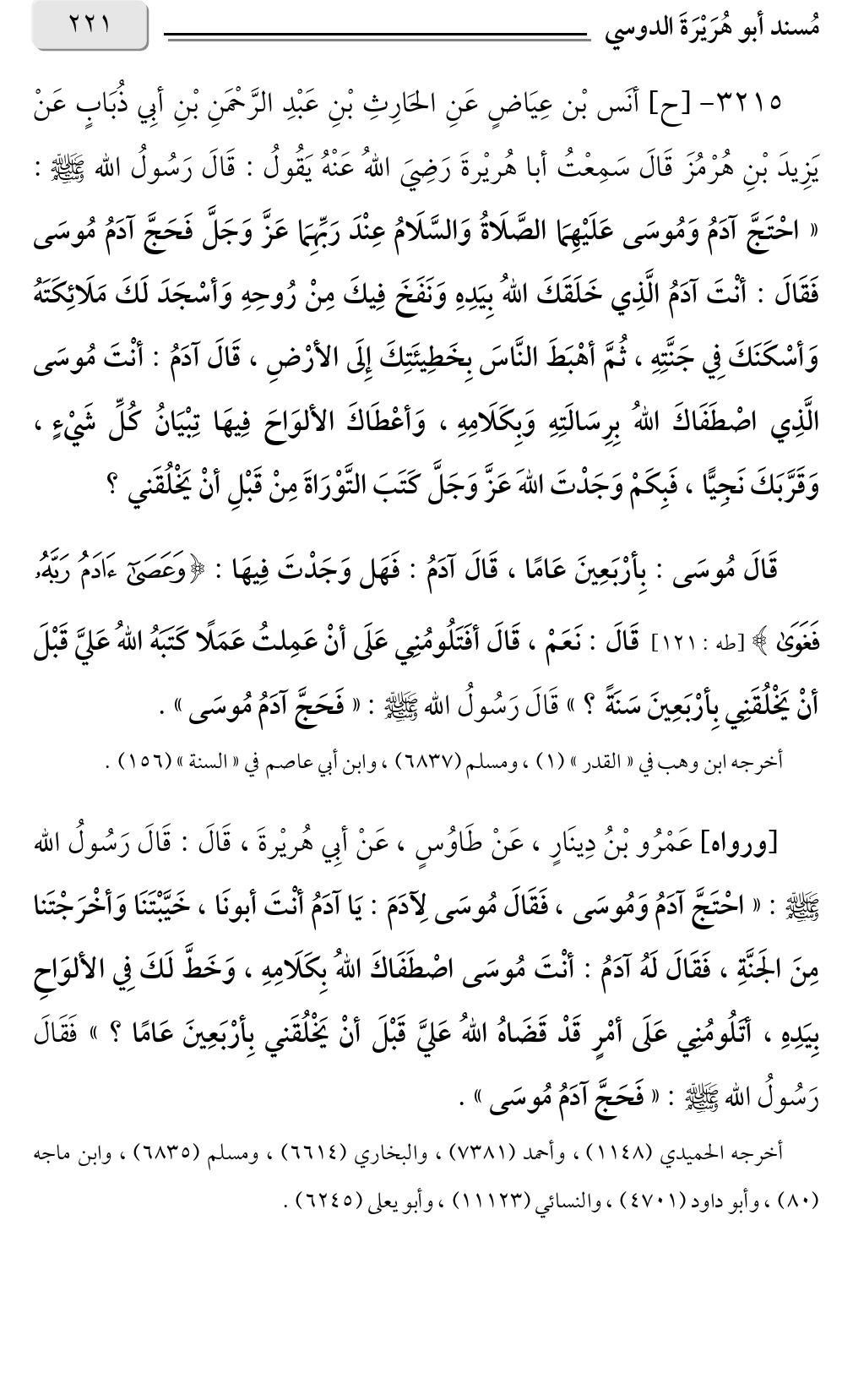 ٣٢١٥ - [ح] أنَس بْن عِيَاضٍ عَنِ الحَارِثِ بْنِ عَبْدِ الرَّحْمَنِ بْنِ أبِي ذُبَابٍ عَنْ يَزِيدَ بْنِ هُرْمُزَ قَالَ سَمِعْتُ أبا هُريْرةَ رَضِيَ اللهُ عَنْهُ يَقُولُ: قَالَ رَسُولُ الله صلى الله عليه وسلم: «احْتَجَّ آدَمُ وَمُوسَى عَلَيْهِمَا الصَّلَاةُ وَالسَّلَامُ عِنْدَ رَبِّهِمَا عَزَّ وَجَلَّ فَحَجَّ آدَمُ مُوسَى فَقَالَ: أنْتَ آدَمُ الَّذِي خَلَقَكَ اللهُ بِيَدِهِ وَنَفَخَ فِيكَ مِنْ رُوحِهِ وَأسْجَدَ لَكَ مَلَائِكَتَهُ وَأسْكَنَكَ فِي جَنَّتِهِ، ثُمَّ أهْبَطَ النَّاسَ بِخَطِيئَتِكَ إِلَى الأرْضِ، قَالَ آدَمُ: أنْتَ مُوسَى الَّذِي اصْطَفَاكَ اللهُ بِرِسَالَتِهِ وَبِكَلَامِهِ، وَأعْطَاكَ الألوَاحَ فِيهَا تِبْيَانُ كُلِّ شَيْءٍ، وَقَرَّبَكَ نَجِيًّا، فَبِكَمْ وَجَدْتَ اللهَ عَزَّ وَجَلَّ كَتَبَ التَّوْرَاةَ مِنْ قَبْلِ أنْ يَخْلُقَني؟