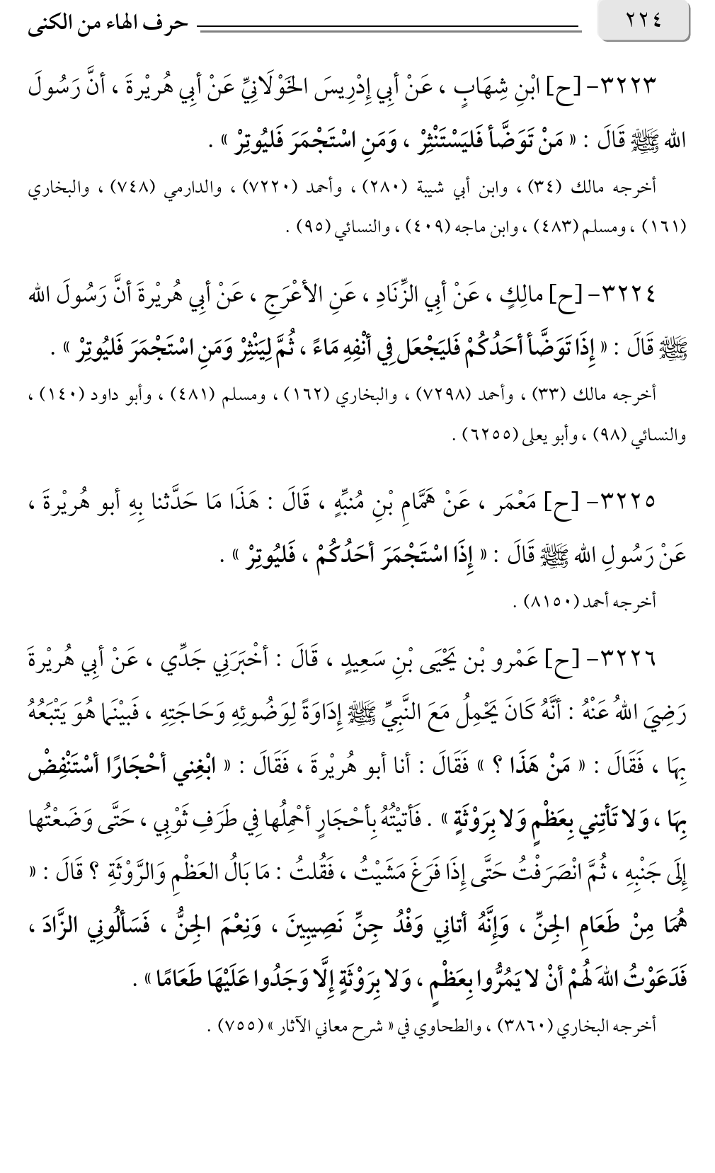 ٣٢٢٣ - [ح] ابْنِ شِهَابٍ، عَنْ أبِي إِدْرِيسَ الخَوْلَانِيِّ عَنْ أبِي هُريْرةَ، أنَّ رَسُولَ الله صلى الله عليه وسلم قَالَ: «مَنْ تَوَضَّأ فَليَسْتَنْثِرْ، وَمَنِ اسْتَجْمَرَ فَليُوتِرْ».