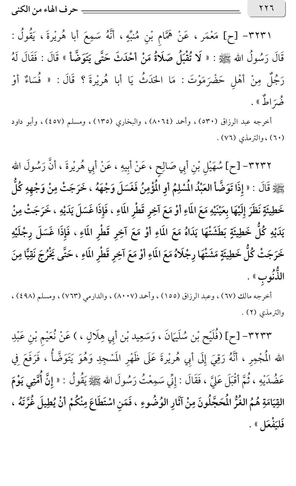 ٣٢٣٣ - [ح] (فُلَيْح بْن سُلَيمَانَ، وَسَعِيد بْن أبِي هِلَالٍ، ) عَنْ نُعَيْمِ بْنِ عَبْدِ الله المُجْمِرِ، أنَّهُ رَقِيَ إِلَى أبِي هُريْرةَ عَلَى ظَهْرِ المَسْجِدِ وَهُوَ يَتَوَضَّأُ، فَرَفَعَ فِي عَضُدَيْهِ، ثُمَّ أقْبَلَ عَليَّ، فَقَالَ: إِنِّي سَمِعْتُ رَسُولَ الله صلى الله عليه وسلم يَقُولُ: «إِنَّ أُمَّتِي يَوْمَ القِيَامَةِ هُمُ الغُرُّ المُحَجَّلُونَ مِنْ آثَارِ الوُضُوءِ، فَمَنِ اسْتَطَاعَ مِنْكُمْ أنْ يُطِيلَ غُرَّتَهُ، فَليَفْعَل».