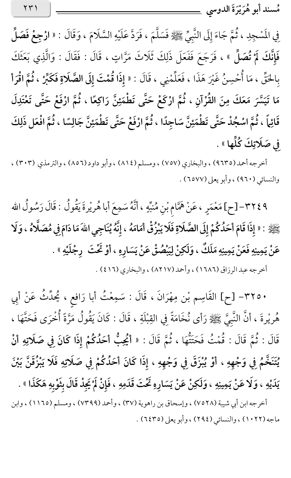 فِي المَسْجِدِ، ثُمَّ جَاءَ إِلَى النَّبِيِّ صلى الله عليه وسلم فَسَلَّمَ، فَرَدَّ عَلَيْهِ السَّلَامَ، وَقَالَ: «ارْجِعْ فَصَلِّ فَإِنَّكَ لَمْ تُصَلِّ» فَرَجَعَ فَفَعَلَ ذَلِكَ ثَلَاثَ مَرَّاتٍ، قَالَ: فَقَالَ: وَالَّذِي بَعَثَكَ، بِالحَقِّ، مَا أُحْسِنُ غَيْرَ هَذَا، فَعَلِّمْنِي، قَالَ: «إِذَا قُمْتَ إِلَى الصَّلَاةِ فَكَبِّرْ، ثُمَّ اقْرَأ مَا تَيَسَّرَ مَعَكَ مِنَ القُرْآنِ، ثُمَّ ارْكَعْ حَتَّى تَطْمَئِنَّ رَاكِعًا، ثُمَّ ارْفَعْ حَتَّى تَعْتَدِلَ قَائِمًا، ثُمَّ اسْجُدْ حَتَّى تَطْمَئِنَّ سَاجِدًا، ثُمَّ ارْفَعْ حَتَّى تَطْمَئِنَّ جَالِسًا، ثُمَّ افْعَل ذَلِكَ فِي صَلَاتِكَ كُلِّها».