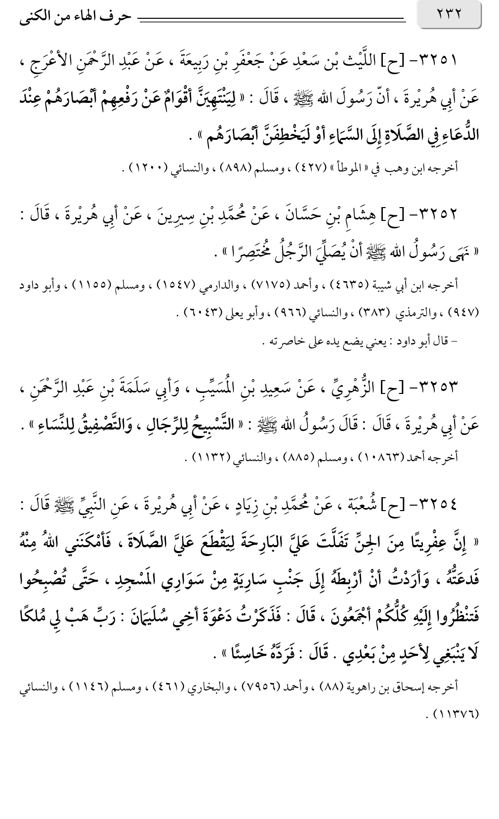 ٣٢٥٢ - [ح] هِشَامِ بْنِ حَسَّانَ، عَنْ مُحمَّدِ بْنِ سِيرِينَ، عَنْ أبِي هُريْرةَ، قَالَ: «نَهَى رَسُولُ الله صلى الله عليه وسلم أنْ يُصَلِّيَ الرَّجُلُ مُختَصِرًا».
