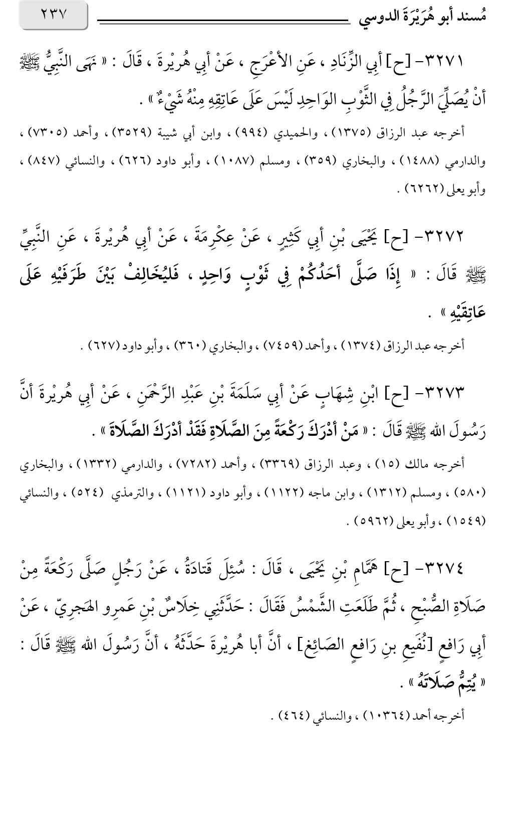 ٣٢٧١ - [ح] أبِي الزِّنَادِ، عَنِ الأعْرَجِ، عَنْ أبِي هُريْرةَ، قَالَ: «نَهَى النَّبِيُّ صلى الله عليه وسلم أنْ يُصَلِّيَ الرَّجُلُ فِي الثَّوْبِ الوَاحِدِ لَيْسَ عَلَى عَاتِقِهِ مِنْهُ شَيْءٌ».