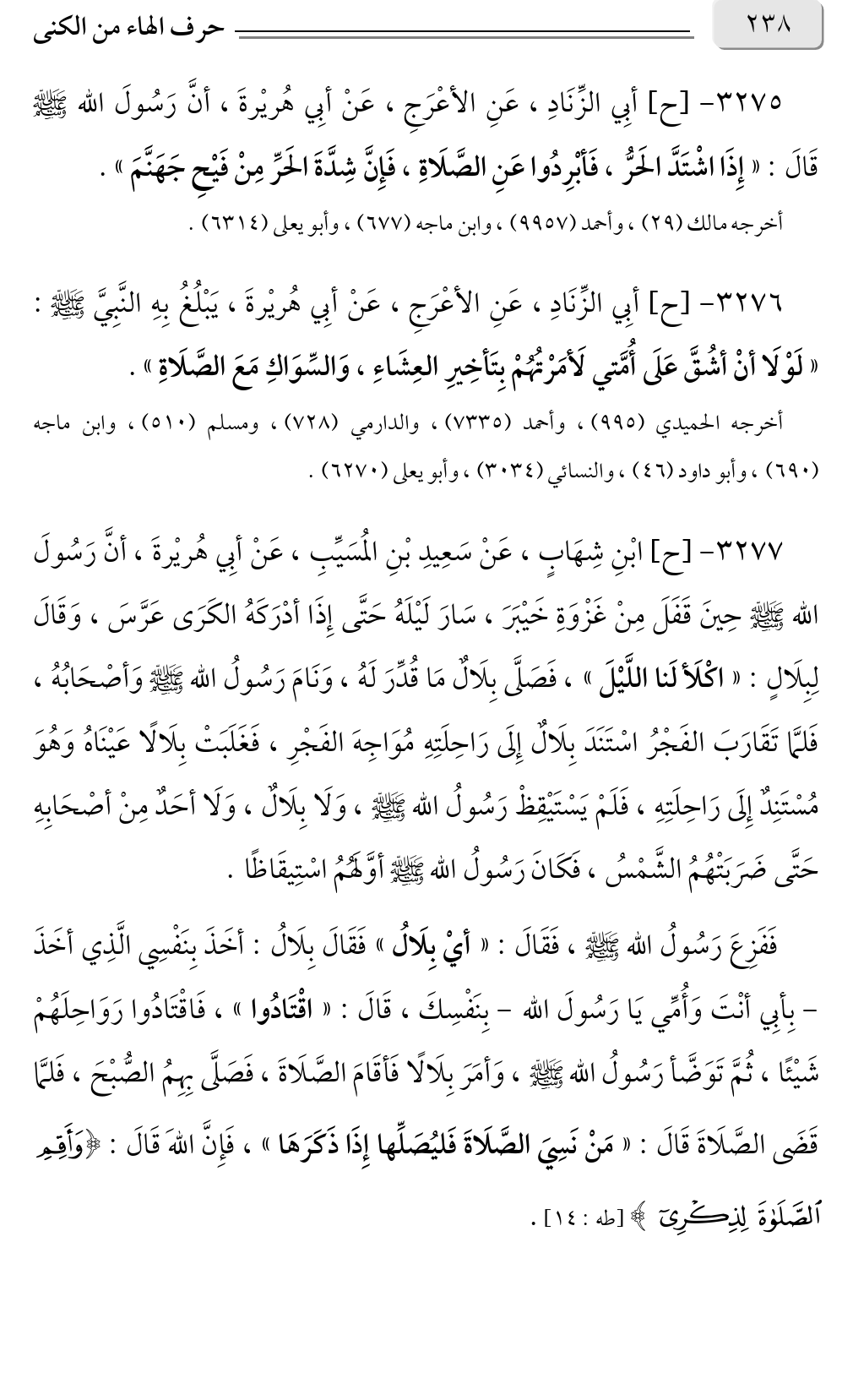 ٣٢٧٧ - [ح] ابْنِ شِهَابٍ، عَنْ سَعِيدِ بْنِ المُسَيِّبِ، عَنْ أبِي هُريْرةَ، أنَّ رَسُولَ الله صلى الله عليه وسلم حِينَ قَفَلَ مِنْ غَزْوَةِ خَيْبَرَ، سَارَ لَيْلَهُ حَتَّى إِذَا أدْرَكَهُ الكَرَى عَرَّسَ، وَقَالَ لِبِلَالٍ: «اكْلَأ لَنا اللَّيْلَ» فَصَلَّى بِلَالٌ مَا قُدِّرَ لَهُ، وَنَامَ رَسُولُ الله صلى الله عليه وسلم وَأصْحَابُهُ، فَلمَّا تَقَارَبَ الفَجْرُ اسْتَنَدَ بِلَالٌ إِلَى رَاحِلَتِهِ مُوَاجِهَ الفَجْرِ، فَغَلَبَتْ بِلَالًا عَيْنَاهُ وَهُوَ مُسْتَنِدٌ إِلَى رَاحِلَتِهِ، فَلَمْ يَسْتَيْقِظْ رَسُولُ الله صلى الله عليه وسلم، وَلَا بِلَالٌ، وَلَا أحَدٌ مِنْ أصْحَابِهِ حَتَّى ضَرَبَتْهُمُ الشَّمْسُ، فَكَانَ رَسُولُ الله صلى الله عليه وسلم أوَّلَهُمُ اسْتِيقَاظًا.