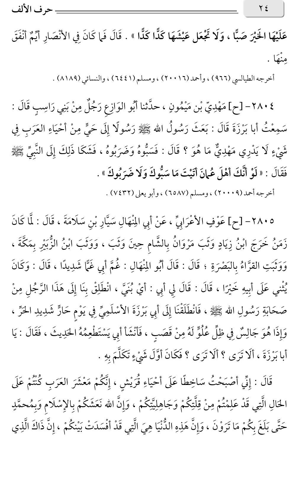 ٢٨٠٥ - [ح] عَوْفٍ الأعْرَابِيِّ، عَنْ أبِي المِنْهَالِ سَيَّارِ بْنِ سَلَامَةَ، قَالَ: لمَّا كَانَ زَمَنُ خَرَجَ ابْنُ زِيَادٍ وَثَبَ مَرْوَانُ بِالشَّامِ حِينَ وَثَبَ، وَوَثَبَ ابْنُ الزُّبَيْرِ بِمَكَّةَ، وَوَثَبَتِ القرَّاءُ بِالبَصْرَةِ؛ قَالَ: قَالَ أبُو المِنْهَالِ: غُمَّ أبِي غَمًّا شَدِيدًا، قَالَ: وَكَانَ يُثْني عَلَى أبِيهِ خَيْرًا، قَالَ: قَالَ لِي أبِي: أيْ بُنَيَّ، انْطَلِقْ بِنَا إِلَى هَذَا الرَّجُلِ مِنْ صَحَابَةِ رَسُولِ الله صلى الله عليه وسلم، فَانْطَلَقْنَا إِلَى أبِي بَرْزَةَ الأسْلَمِيِّ فِي يَوْمٍ حَارٍّ شَدِيدِ الحَرِّ، وَإِذَا هُوَ جَالِسٌ فِي ظِلِّ عُلُوٍّ لَهُ مِنْ قَصَبٍ، فَأنْشَأ أبِي يَسْتَطْعِمُهُ الحَدِيثَ، فَقَالَ: يَا أبا بَرْزَةَ، ألَا تَرَى؟ ألَا تَرَى؟ فَكَانَ أوَّلَ شَيْءٍ تَكَلَّمَ بِهِ.