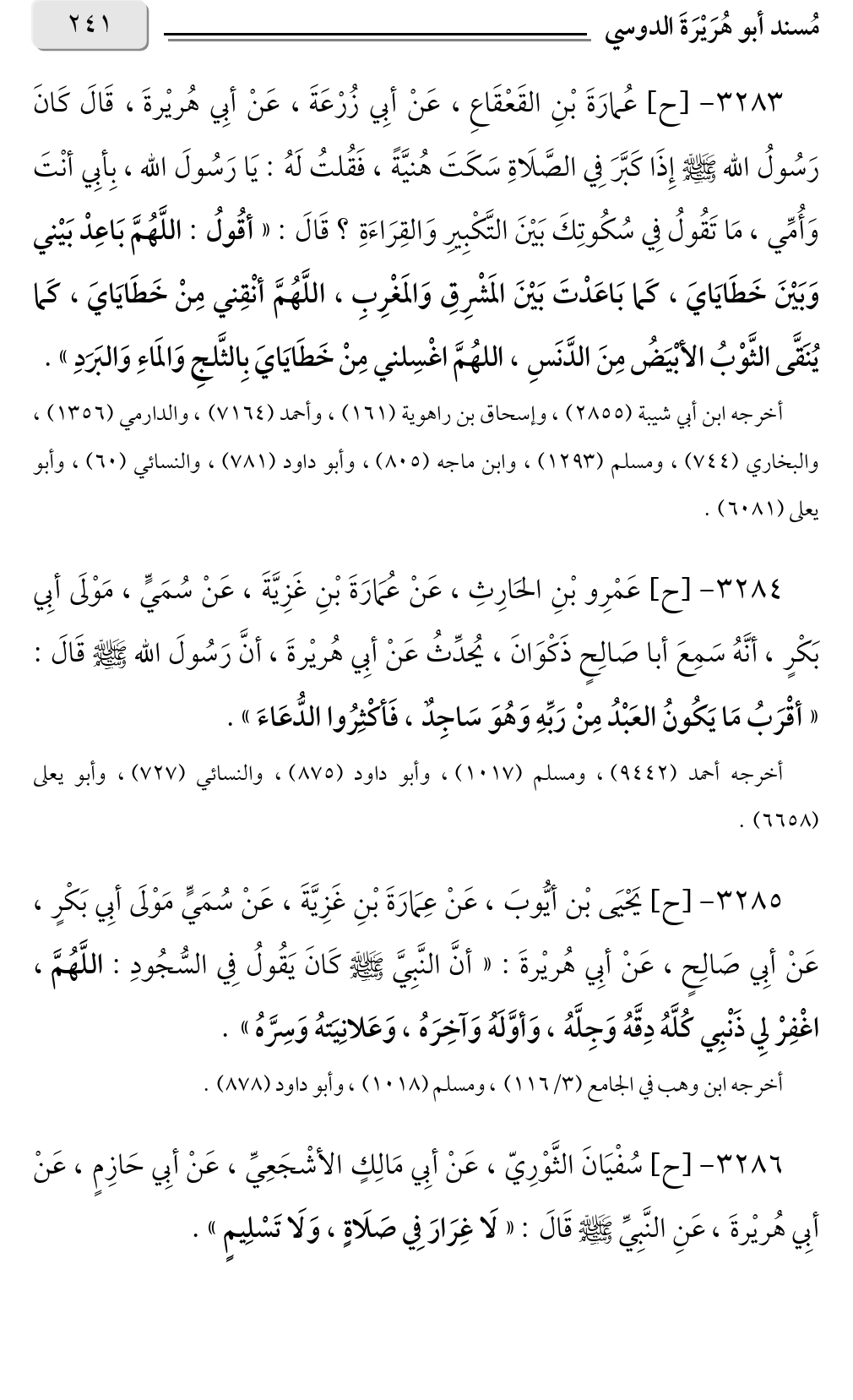 ٣٢٨٣ - [ح] عُمارَةَ بْنِ القَعْقَاعِ، عَنْ أبِي زُرْعَةَ، عَنْ أبِي هُريْرةَ، قَالَ كَانَ رَسُولُ الله صلى الله عليه وسلم إِذَا كَبَّرَ فِي الصَّلَاةِ سَكَتَ هُنيَّةً، فَقُلتُ لَهُ: يَا رَسُولَ الله، بِأبِي أنْتَ وَأُمِّي، مَا تَقُولُ فِي سُكُوتِكَ بَيْنَ التَّكْبِيرِ وَالقِرَاءَةِ؟ قَالَ: «أقُولُ: اللَّهُمَّ بَاعِدْ بَيْني وَبَيْنَ خَطَايَايَ، كَما بَاعَدْتَ بَيْنَ المَشْرِقِ وَالمَغْرِبِ، اللَّهُمَّ أنْقِني مِنْ خَطَايَايَ، كَما يُنَقَّى الثَّوْبُ الأبْيَضُ مِنَ الدَّنَسِ، اللهُمَّ اغْسِلني مِنْ خَطَايَايَ بِالثَّلجِ وَالمَاءِ وَالبَرَدِ».