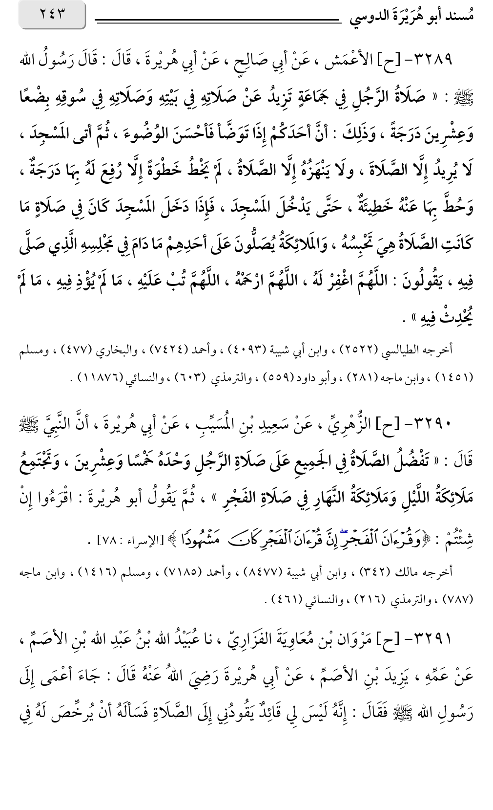 ٣٢٨٩ - [ح] الأعْمَش، عَنْ أبِي صَالِحٍ، عَنْ أبِي هُريْرةَ، قَالَ: قَالَ رَسُولُ الله صلى الله عليه وسلم: «صَلَاةُ الرَّجُلِ فِي جَمَاعَةٍ تَزِيدُ عَنْ صَلَاتِهِ فِي بَيْتِهِ وَصَلَاتِهِ فِي سُوقِهِ بِضْعًا وَعِشْرِينَ دَرَجَةً، وَذَلِكَ: أنَّ أحَدَكُمْ إِذَا تَوَضَّأ فَأحْسَنَ الوُضُوءَ، ثُمَّ أتى المَسْجِدَ، لَا يُرِيدُ إِلَّا الصَّلَاةَ، ولَا يَنْهَزُهُ إِلَّا الصَّلَاةُ، لَمْ يَخْطُ خَطْوَةً إِلَّا رُفِعَ لَهُ بِهَا دَرَجَةٌ، وَحُطَّ بِهَا عَنْهُ خَطِيئَةٌ، حَتَّى يَدْخُلَ المَسْجِدَ، فَإِذَا دَخَلَ المَسْجِدَ كَانَ فِي صَلَاةٍ مَا كَانَتِ الصَّلَاةُ هِيَ تَحْبِسُهُ، وَالمَلائِكَةُ يُصَلُّونَ عَلَى أحَدِهِمْ مَا دَامَ فِي مَجْلِسِهِ الَّذِي صَلَّى فِيهِ، يَقُولُونَ: اللَّهُمَّ اغْفِرْ لَهُ، اللَّهُمَّ ارْحَمْهُ، اللَّهُمَّ تُبْ عَلَيْهِ، مَا لَمْ يُؤْذِ فِيهِ، مَا لَمْ يُحْدِثْ فِيهِ».