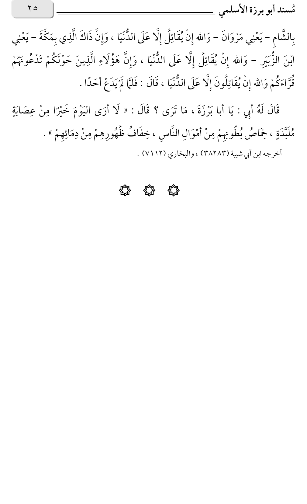 قَالَ لَهُ أبِي: يَا أبا بَرْزَةَ، مَا تَرَى؟ قَالَ: «لَا أرَى اليَوْمَ خَيْرًا مِنْ عِصَابَةٍ مُلَبَّدَةٍ، خِمَاصُ بُطُونِهِمْ مِنْ أمْوَالِ النَّاسِ، خِفَافُ ظُهُورِهِمْ مِنْ دِمَائِهِمْ».