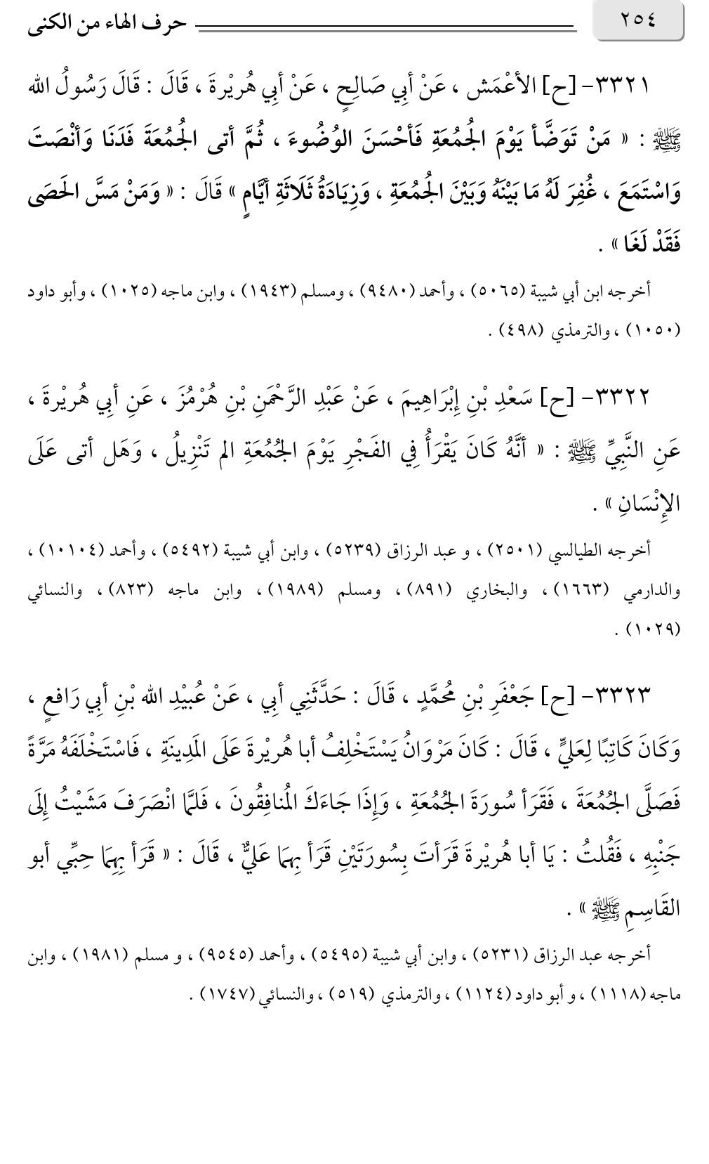 ٣٣٢٢ - [ح] سَعْدِ بْنِ إِبْرَاهِيمَ، عَنْ عَبْدِ الرَّحْمَنِ بْنِ هُرْمُزَ، عَنِ أبِي هُريْرةَ، عَنِ النَّبِيِّ صلى الله عليه وسلم: «أنَّهُ كَانَ يَقْرَأُ فِي الفَجْرِ يَوْمَ الجُمُعَةِ الم تَنْزِيلُ، وَهَل أتى عَلَى الإِنْسَانِ».