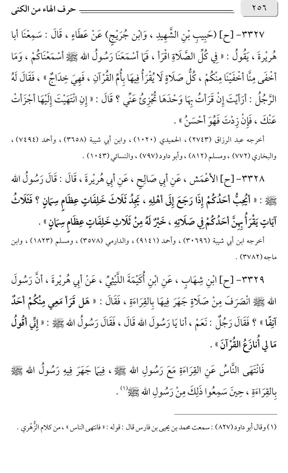 ٣٣٢٩ - [ح] ابْنِ شِهَابٍ، عَنِ ابْنِ أُكَيْمَةَ اللَّيْثِيِّ، عَنْ أبِي هُريْرةَ، أنَّ رَسُولَ الله صلى الله عليه وسلم انْصَرَفَ مِنْ صَلَاةٍ جَهَرَ فِيهَا بِالقِرَاءَةِ، فَقَالَ: «هَل قَرَأ مَعِي مِنْكُمْ أحَدٌ آنِفًا» فَقَالَ رَجُلٌ: نَعَمْ، أنا يَا رَسُولَ الله قَالَ، فَقَالَ رَسُولُ الله صلى الله عليه وسلم؟ : «إِنِّي أقُولُ مَا لي أُنازَعُ القُرْآنَ».