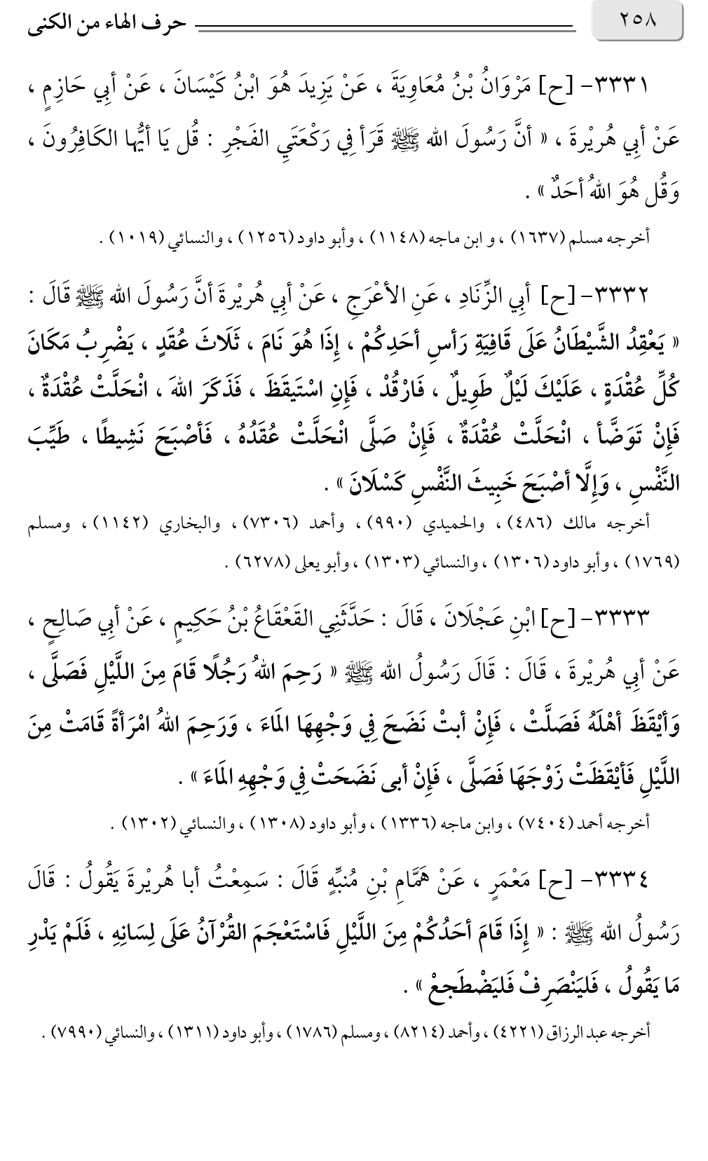 ٣٣٣٢ - [ح] أبِي الزِّنَادِ، عَنِ الأعْرَجِ، عَنْ أبِي هُريْرةَ أنَّ رَسُولَ الله صلى الله عليه وسلم قَالَ: «يَعْقِدُ الشَّيْطَانُ عَلَى قَافِيَةِ رَأسِ أحَدِكُمْ، إِذَا هُوَ نَامَ، ثَلَاثَ عُقَدٍ، يَضْرِبُ مَكَانَ كُلِّ عُقْدَةٍ، عَلَيْكَ لَيْلٌ طَوِيلٌ، فَارْقُدْ، فَإِنِ اسْتَيقَظَ، فَذَكَرَ اللهَ، انْحَلَّتْ عُقْدَةٌ، فَإِنْ تَوَضَّأ، انْحَلَّتْ عُقْدَةٌ، فَإِنْ صَلَّى انْحَلَّتْ عُقَدُهُ، فَأصْبَحَ نَشِيطًا، طَيِّبَ النَّفْسِ، وَإِلَّا أصْبَحَ خَبِيثَ النَّفْسِ كَسْلَانَ».