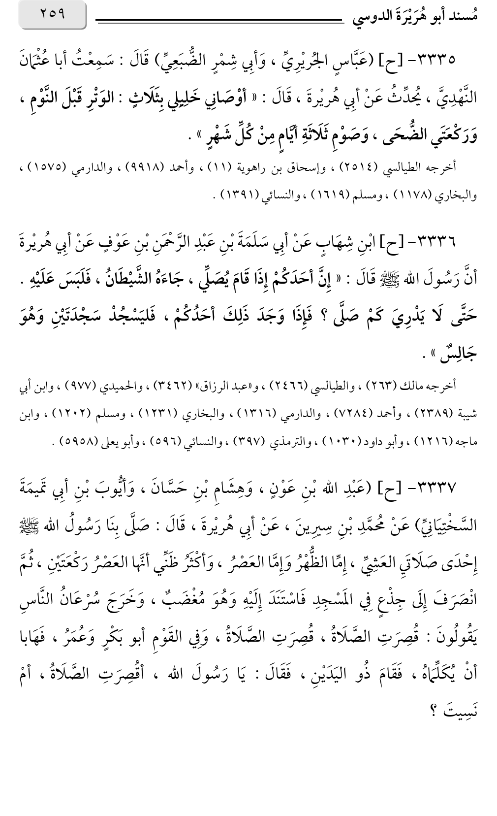 ٣٣٣٥ - [ح] (عَبَّاسٍ الجُريْرِيِّ، وَأبِي شِمْرٍ الضُّبَعِيِّ) قَالَ: سَمِعْتُ أبا عُثْمَانَ النَّهْدِيَّ، يُحدِّثُ عَنْ أبِي هُريْرةَ، قَالَ: «أوْصَانِي خَلِيِلي بِثَلَاثٍ: الوَتْرِ قَبْلَ النَّوْمِ، وَرَكْعَتَي الضُّحَى، وَصَوْمِ ثَلَاثَةِ أيَّامٍ مِنْ كُلِّ شَهْرٍ».