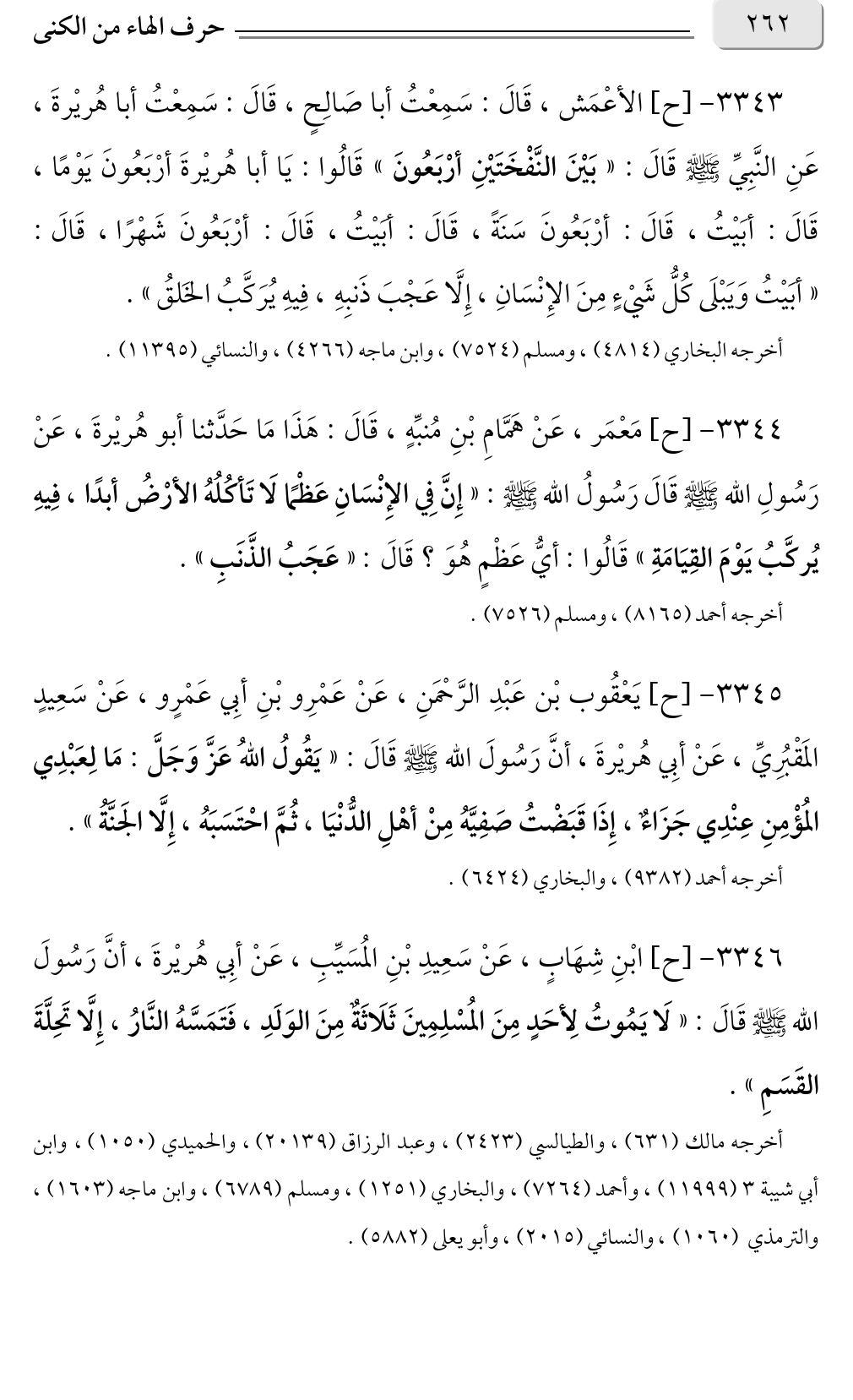 ٣٣٤٣ - [ح] الأعْمَش، قَالَ: سَمِعْتُ أبا صَالِحٍ، قَالَ: سَمِعْتُ أبا هُريْرةَ، عَنِ النَّبِيِّ صلى الله عليه وسلم قَالَ: «بَيْنَ النَّفْخَتَيْنِ أرْبَعُونَ» قَالُوا: يَا أبا هُريْرةَ أرْبَعُونَ يَوْمًا، قَالَ: أبَيْتُ، قَالَ: أرْبَعُونَ سَنَةً، قَالَ: أبَيْتُ، قَالَ: أرْبَعُونَ شَهْرًا، قَالَ: «أبَيْتُ وَيَبْلَى كُلُّ شَيْءٍ مِنَ الإِنْسَانِ، إِلَّا عَجْبَ ذَنبِهِ، فِيهِ يُرَكَّبُ الخَلقُ».