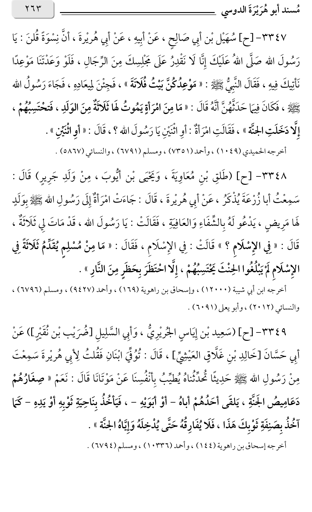٣٣٤٩ - [ح] (سَعِيد بْن إِيَاسٍ الجُريْرِيُّ، وَأبِي السَّلِيلِ [ضُرَيْب بْن نُقَيْرٍ]) عَنْ أبِي حَسَّانَ [خَالِدِ بْنِ غَلَّاقٍ العَيْشِيِّ]، قَالَ: تُوُفِّيَ ابْنَانِ فَقُلتُ لِأبِي هُريْرةَ سَمِعْتَ مِنْ رَسُولِ الله صلى الله عليه وسلم حَدِيثًا تُحدِّثُناهُ يُطيِّبُ بِأنْفُسِنَا عَنْ مَوْتَانَا قَالَ: نَعَمْ «صِغَارُهُمْ دَعَامِيصُ الجَنَّةِ، يَلقَى أحَدُهُمْ أباهُ - أوْ أبَوَيْهِ -، فَيَأخُذُ بِنَاحِيَةِ ثَوْبِهِ أوْ يَدِهِ - كَمَا آخُذُ بِصَنِفَةِ ثَوْبِكَ هَذَا، فَلَا يُفَارِقُهُ حَتَّى يُدْخِلَهُ وَإِيَّاهُ الجنَّة».