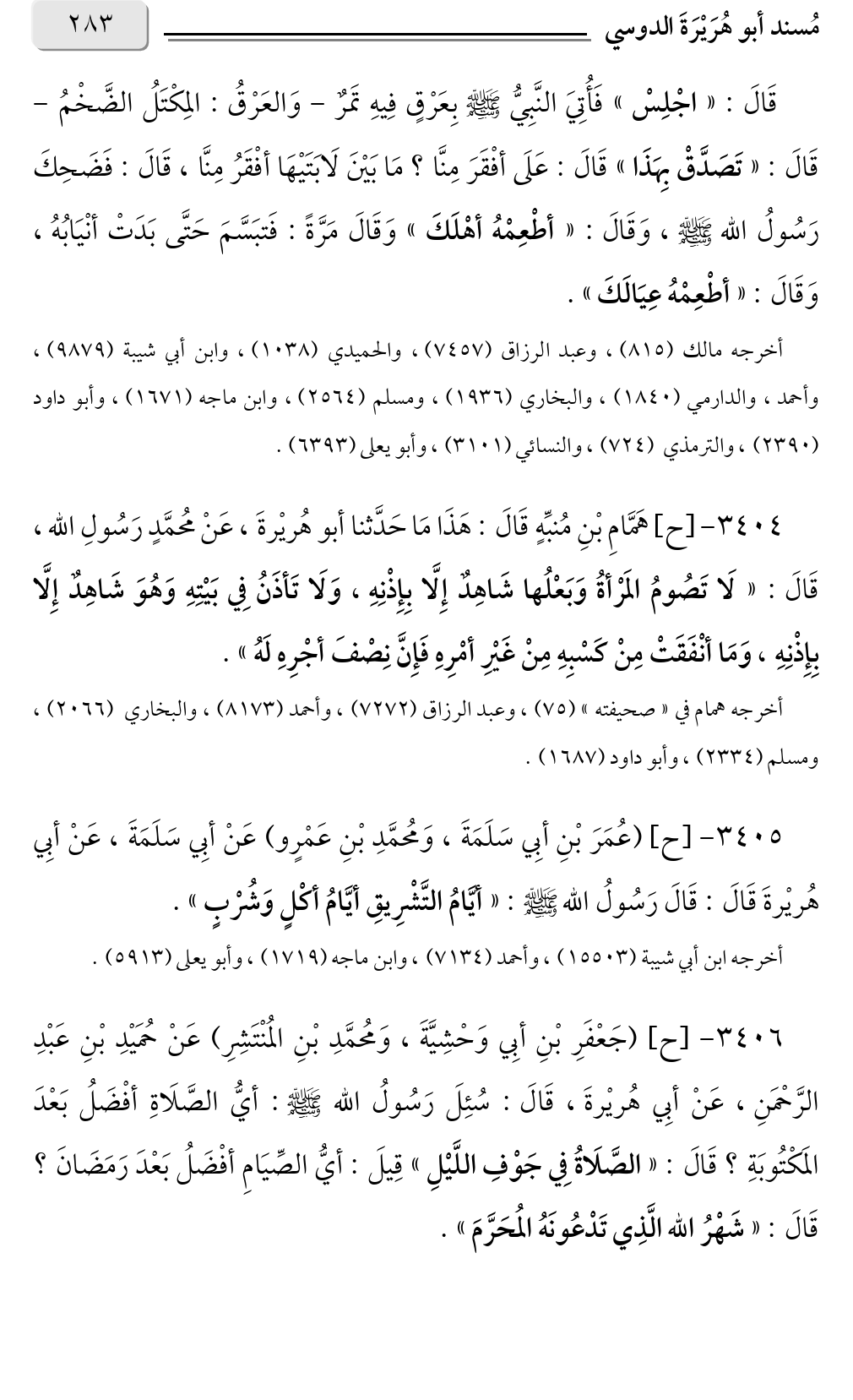 ٣٤٠٤ - [ح] هَمَّامِ بْنِ مُنبِّهٍ قَالَ: هَذَا مَا حَدَّثنا أبو هُريْرةَ، عَنْ مُحمَّدٍ رَسُولِ الله، قَالَ: «لَا تَصُومُ المَرْأةُ وَبَعْلُها شَاهِدٌ إِلَّا بِإِذْنِهِ، وَلَا تَأذَنُ فِي بَيْتِهِ وَهُوَ شَاهِدٌ إِلَّا بِإِذْنِهِ، وَمَا أنْفَقَتْ مِنْ كَسْبِهِ مِنْ غَيْرِ أمْرِهِ فَإِنَّ نِصْفَ أجْرِهِ لَهُ».