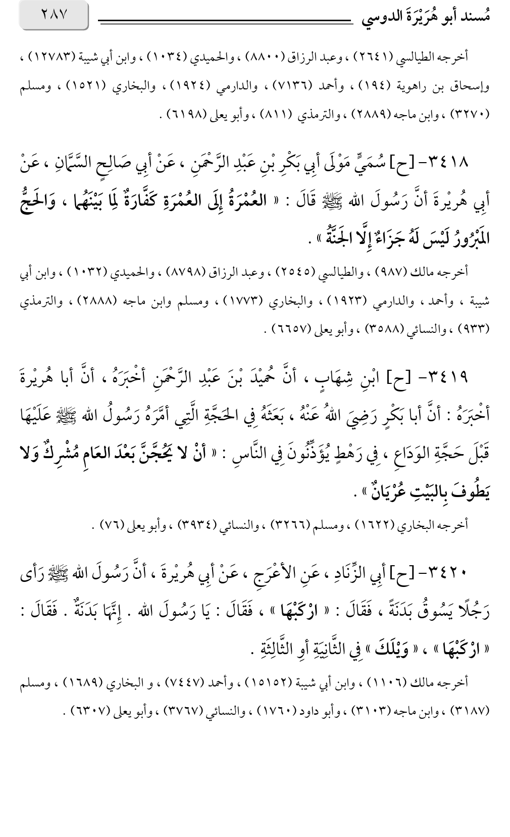 أخرجه الطيالسي (٢٦٤١)، وعبد الرزاق (٨٨٠٠)، والحميدي (١٠٣٤)، وابن أبي شيبة (١٢٧٨٣)، وإسحاق بن راهوية (١٩٤)، وأحمد (٧١٣٦)، والدارمي (١٩٢٤)، والبخاري (١٥٢١)، ومسلم (٣٢٧٠)، وابن ماجة (٢٨٨٩)، والترمذي (٨١١)، وأبو يعلى (٦١٩٨).