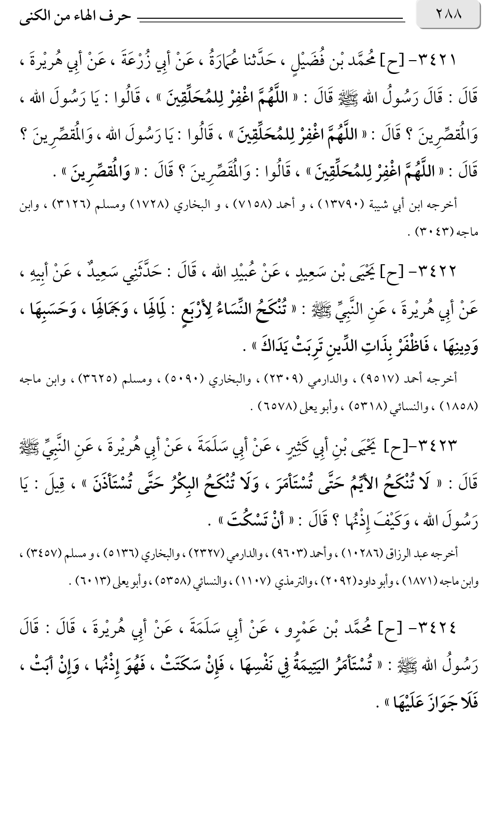 ٣٤٢١ - [ح] مُحمَّد بْن فُضَيْلٍ، حَدَّثنا عُمَارَةُ، عَنْ أبِي زُرْعَةَ، عَنْ أبِي هُريْرةَ، قَالَ: قَالَ رَسُولُ الله صلى الله عليه وسلم قَالَ: «اللَّهُمَّ اغْفِرْ لِلمُحَلِّقِينَ» قَالُوا: يَا رَسُولَ الله، وَالمُقصِّرِينَ؟ قَالَ: «اللَّهُمَّ اغْفِرْ لِلمُحَلِّقِينَ» قَالُوا: يَا رَسُولَ الله، وَالمُقصِّرِينَ؟ ، قَالَ: «اللَّهُمَّ اغْفِرْ لِلمُحَلِّقِينَ» قَالُوا: وَالمُقَصِّرِينَ؟ قَالَ: «وَالمُقصِّرِينَ».