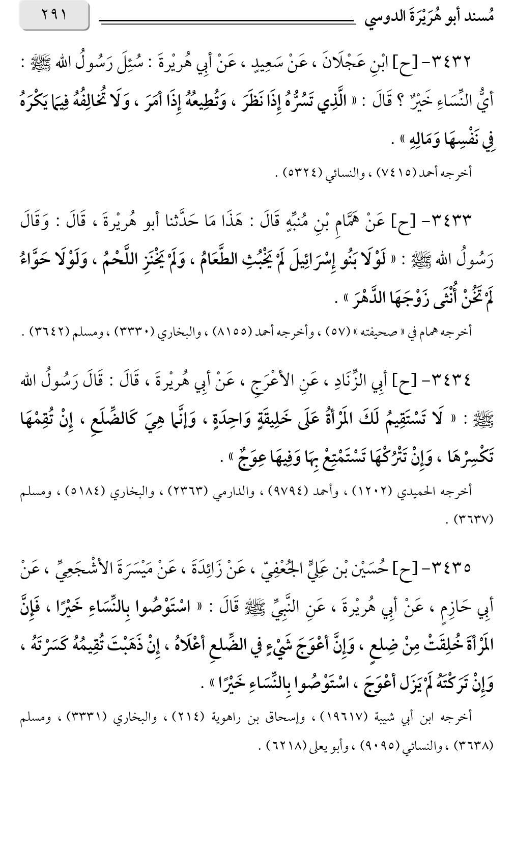 ٣٤٣٥ - [ح] حُسَيْن بْن عَلِيٍّ الجُعْفِيّ، عَنْ زَائِدَةَ، عَنْ مَيْسَرَةَ الأشْجَعِيِّ، عَنْ أبِي حَازِمٍ، عَنْ أبِي هُريْرةَ، عَنِ النَّبِيِّ صلى الله عليه وسلم قَالَ: «اسْتَوْصُوا بِالنِّسَاءِ خَيْرًا، فَإِنَّ المَرْأةَ خُلِقَتْ مِنْ ضِلعٍ، وَإِنَّ أعْوَجَ شَيْءٍ في الضِّلعِ أعْلَاهُ، إِنْ ذَهَبْتَ تُقِيمُهُ كَسَرْتَهُ، وَإِنْ تَرَكْتَهُ لَمْ يَزَل أعْوَجَ، اسْتَوْصُوا بِالنِّسَاءِ خَيْرًا».