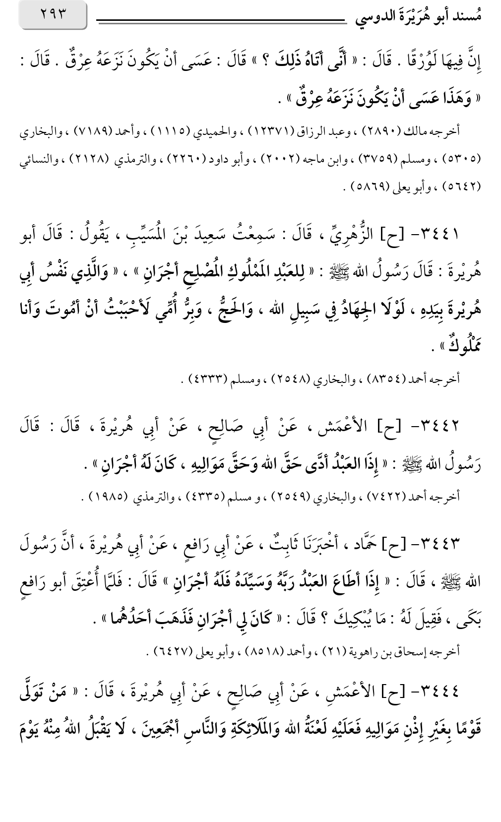 ٣٤٤٣ - [ح] حَمَّاد، أخْبَرَنَا ثَابِتٌ، عَنْ أبِي رَافعٍ، عَنْ أبِي هُريْرةَ، أنَّ رَسُولَ الله صلى الله عليه وسلم، قَالَ: «إِذَا أطَاعَ العَبْدُ رَبَّهُ وَسَيِّدَهُ فَلَهُ أجْرَانِ» قَالَ: فَلمَّا أُعْتِقَ أبو رَافعٍ بَكَى، فَقِيلَ لَهُ: مَا يُبْكِيكَ؟ قَالَ: «كَانَ لِي أجْرَانِ فَذَهَبَ أحَدُهُما».