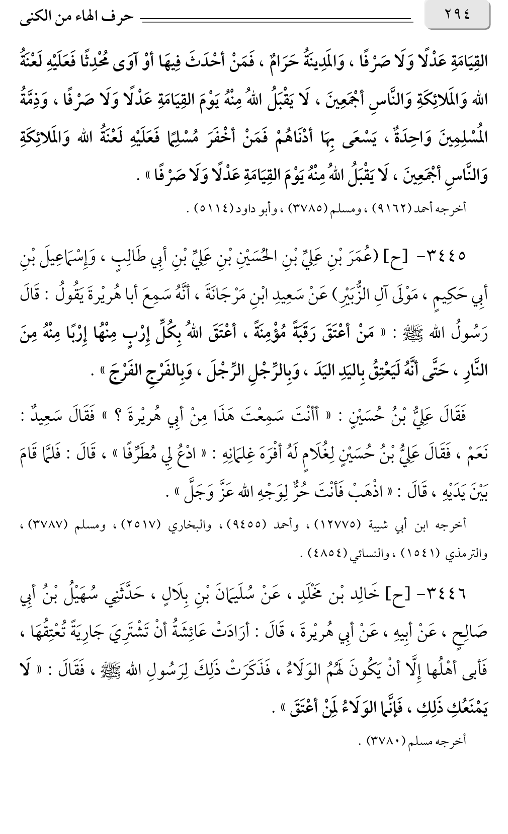 ٣٤٤٥ - [ح] (عُمَرَ بْنِ عَلِيِّ بْنِ الحُسَيْنِ بْنِ عَلِيِّ بْنِ أبِي طَالِبٍ، وَإِسْمَاعِيلَ بْنِ أبِي حَكِيمٍ، مَوْلَى آلِ الزُّبَيْرِ) عَنْ سَعِيدِ ابْنِ مَرْجَانَةَ، أنَّهُ سَمِعَ أبا هُريْرةَ يَقُولُ: قَالَ رَسُولُ الله صلى الله عليه وسلم: «مَنْ أعْتَقَ رَقَبَةً مُؤْمِنَةً، أعْتَقَ اللهُ بِكُلِّ إِرْبٍ مِنْهُا إِرْبًا مِنْهُ مِنَ النَّارِ، حَتَّى أنَّهُ لَيَعْتِقُ بِاليَدِ اليَدَ، وَبِالرِّجْلِ الرِّجْلَ، وَبِالفَرْجِ الفَرْجَ».