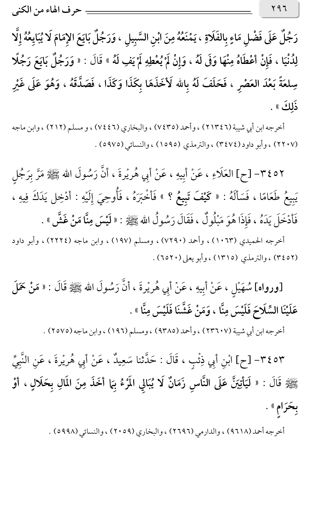 ٣٤٥٢ - [ح] العَلَاءِ، عَنْ أبِيهِ، عَنْ أبِي هُريْرةَ، أنَّ رَسُولَ الله صلى الله عليه وسلم مَرَّ بِرَجُلٍ يَبِيعُ طَعَامًا، فَسَألَهُ: «كَيْفَ تَبِيعُ؟ » فَأخْبَرَهُ، فَأُوحِيَ إِلَيْهِ: أدْخِل يَدَكَ فِيهِ، فَأدْخَلَ يَدَهُ، فَإِذَا هُوَ مَبْلُولٌ، فَقَالَ رَسُولُ الله صلى الله عليه وسلم: «لَيْسَ مِنَّا مَنْ غَشَّ».
