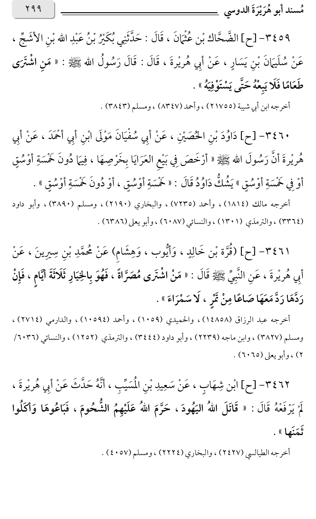 ٣٤٥٩ - [ح] الضَّحَّاك بْن عُثْمَانَ، قَالَ: حَدَّثَنِي بُكَيْرُ بْنُ عَبْدِ الله بْنِ الأشَجِّ، عَنْ سُلَيمَانَ بْنِ يَسَارٍ، عَنْ أبِي هُريْرةَ، قَالَ: قَالَ رَسُولُ الله صلى الله عليه وسلم: «مَنِ اشْتَرَى طَعَامًا فَلَا يَبِعْهُ حَتَّى يَسْتَوْفِيَهُ».