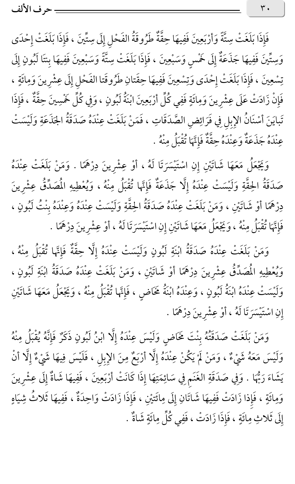 فَإِذَا بَلَغَتْ سِتَّةً وَأرْبَعِينَ فَفِيهَا حِقَّةٌ طَرُوقَةُ الفَحْلِ إِلَى سِتِّينَ، فَإِذَا بَلَغَتْ إِحْدَى وَسِتِّينَ فَفِيهَا جَذَعَةٌ إِلَى خَمْسٍ وَسَبْعِينَ، فَإِذَا بَلَغَتْ سِتَّةً وَسَبْعِينَ فَفِيهَا بِنتَا لَبُونٍ إِلَى تِسْعِينَ، فَإِذَا بَلَغَتْ إِحْدَى وَتِسْعِينَ فَفِيهَا حِقَتانِ طَرُوقَتا الفَحْلِ إِلَى عِشْرِينَ وَمِائَةٍ، فَإِنْ زَادَتْ عَلَى عِشْرِينَ وَمِائَةٍ فَفِي كُلِّ أرْبَعِينَ ابْنَةُ لَبُونٍ، وَفِي كُلِّ خَمْسِينَ حِقَّةٌ، فَإِذَا تَبايَنَ أسْنَانُ الإِبِلِ فِي فَرَائِضِ الصَّدَقَاتِ، فَمَنْ بَلَغَتْ عِنْدَهُ صَدَقَةُ الجَذَعَةِ وَلَيْسَتْ عِنْدَهُ جَذَعَةٌ وَعِنْدَهُ حِقَّةٌ فَإِنَّهَا تُقْبَلُ مِنْهُ.
