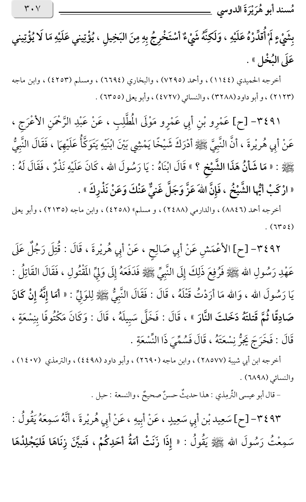 أخرجه الحميدي (١١٤٤)، وأحمد (٧٢٩٥)، والبخاري (٦٦٩٤)، ومسلم (٤٢٥٣)، وابن ماجة (٢١٢٣)، وأبو داود (٣٢٨٨)، والنسائي (٤٧٢٧)، وأبو يعلى (٦٣٥٥).