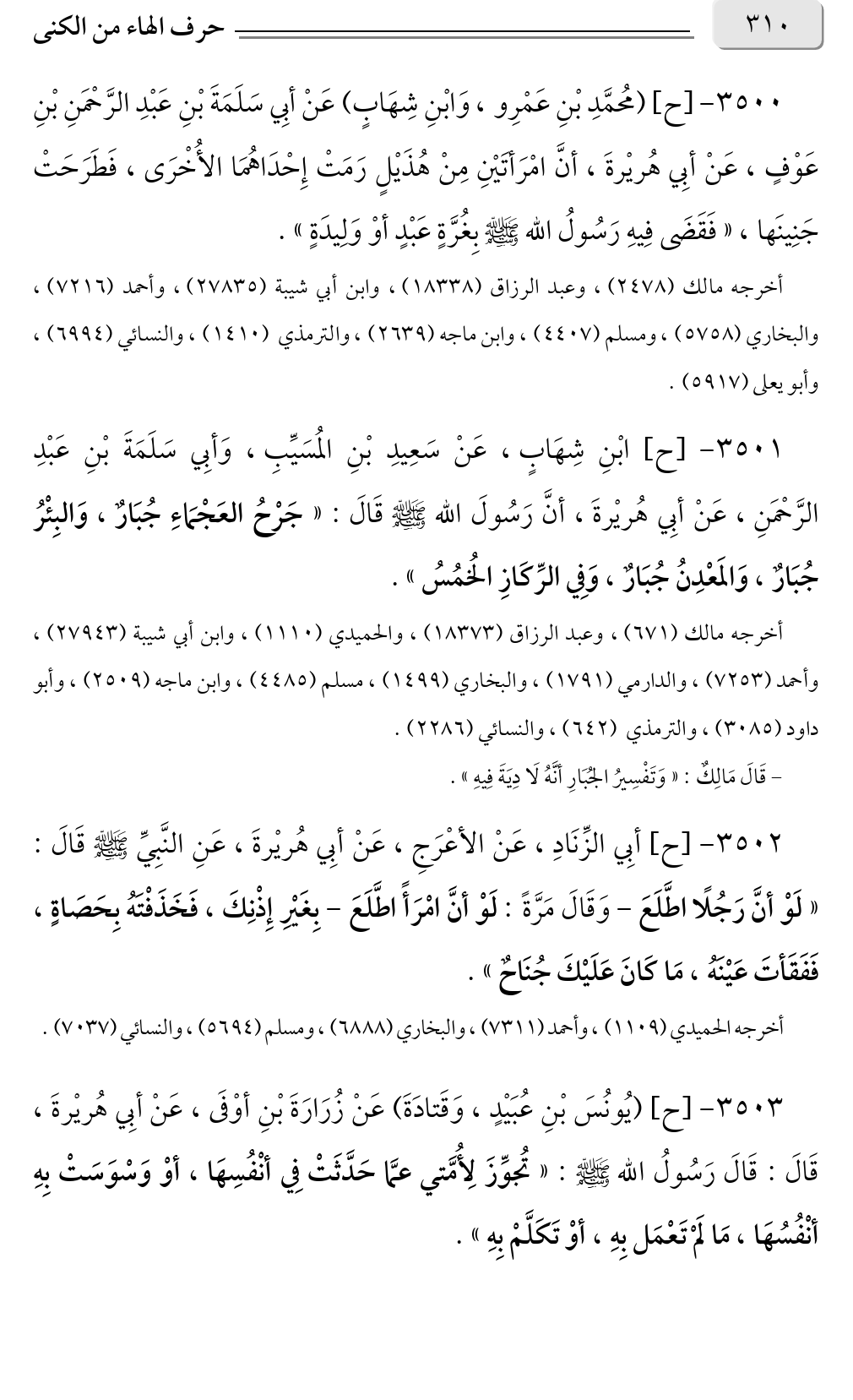 ٣٥٠١ - [ح] ابْنِ شِهَابٍ، عَنْ سَعِيدِ بْنِ المُسَيِّبِ، وَأبِي سَلَمَةَ بْنِ عَبْدِ الرَّحْمَنِ، عَنْ أبِي هُريْرةَ، أنَّ رَسُولَ الله صلى الله عليه وسلم قَالَ: «جَرْحُ العَجْمَاءِ جُبَارٌ، وَالبِئْرُ جُبَارٌ، وَالمَعْدِنُ جُبَارٌ، وَفِي الرِّكَازِ الخُمُسُ».