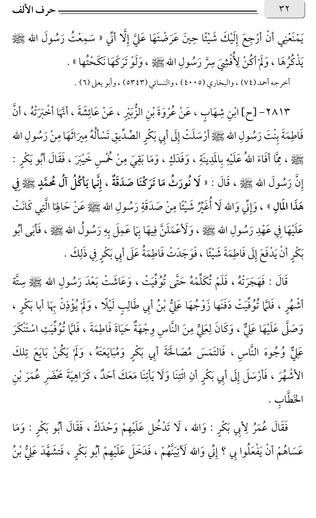 ٢٨١٣ - [ح] ابْنِ شِهَابٍ، عَنْ عُرْوَةَ بْنِ الزُّبَيْرِ، عَنْ عَائِشَةَ، أنَّهَا أخْبَرَتْهُ، أنَّ فَاطِمَةَ بِنْتَ رَسُولِ الله صلى الله عليه وسلم أرْسَلَتْ إِلَى أبِي بَكْرٍ الصِّدِّيقِ تَسْألُهُ مِيرَاثَهَا مِنْ رَسُولِ الله صلى الله عليه وسلم، مِمَّا أفَاءَ اللهُ عَلَيْهِ بِالمَدِينَةِ، وَفَدَكٍ، وَمَا بَقِيَ مِنْ خُمْسِ خَيْبَرَ، فَقَالَ أبُو بَكْرٍ: إِنَّ رَسُولَ الله صلى الله عليه وسلم، قَالَ: «لَا نُورَثُ مَا تَرَكْنَا صَدَقَةٌ، إِنَّما يَأكُلُ آلُ مُحمَّدٍ صلى الله عليه وسلم فِي هَذَا المَالِ» وَإِنِّي وَالله لَا أُغَيِّرُ شَيْئًا مِنْ صَدَقَةِ رَسُولِ الله صلى الله عليه وسلم عَنْ حَالهَا الَّتِي كَانَتْ، عَلَيْهَا فِي عَهْدِ رَسُولِ الله صلى الله عليه وسلم، وَلَأعْمَلَنَّ فِيهَا بِمَا عَمِلَ بِهِ رَسُولُ الله صلى الله عليه وسلم، فَأبَى أبُو بَكْرٍ أنْ يَدْفَعَ إِلَى فَاطِمَةَ شَيْئًا، فَوَجَدَتْ فَاطِمَةُ عَلَى أبِي بَكْرٍ فِي ذَلِكَ.